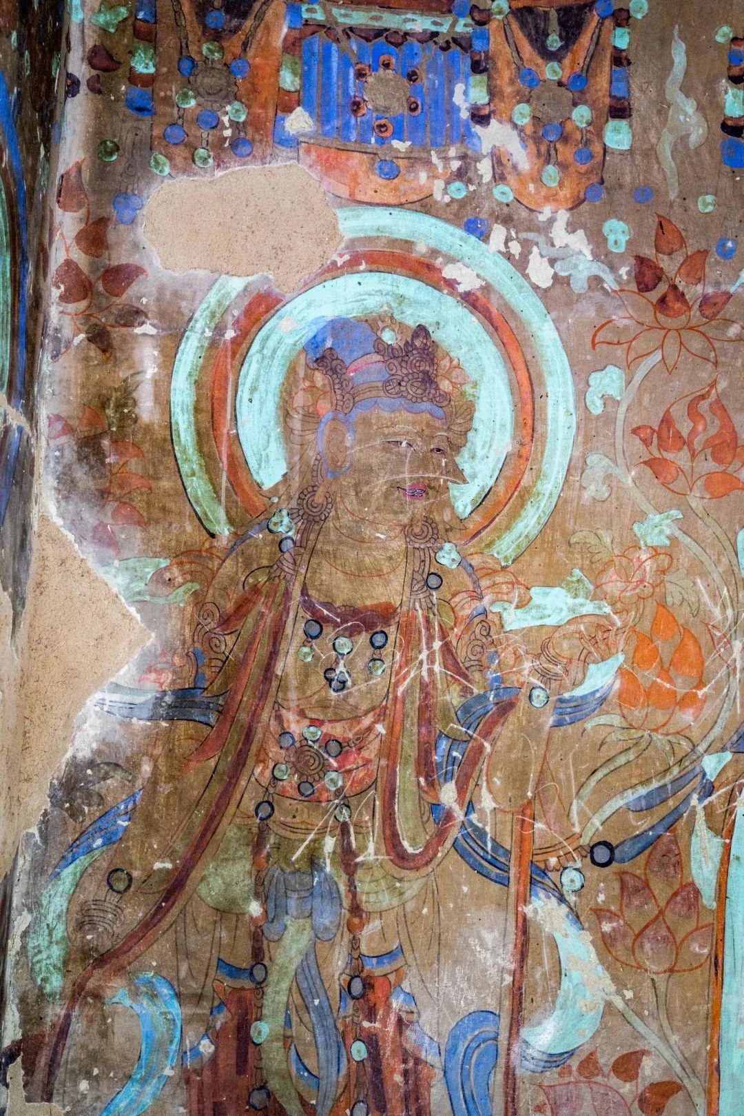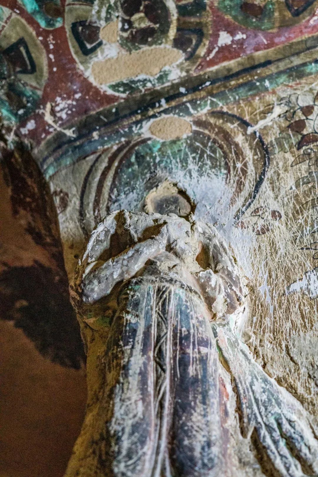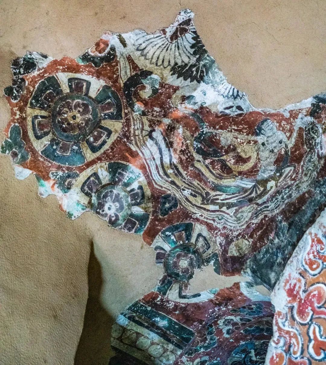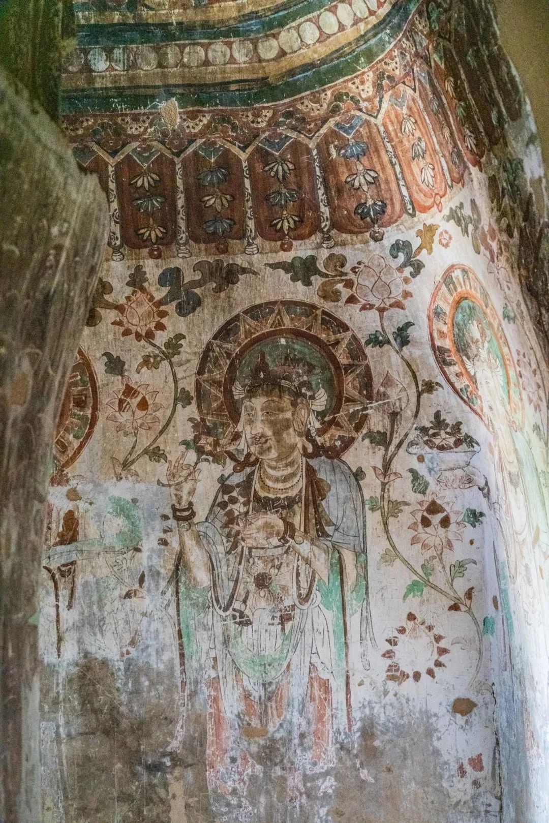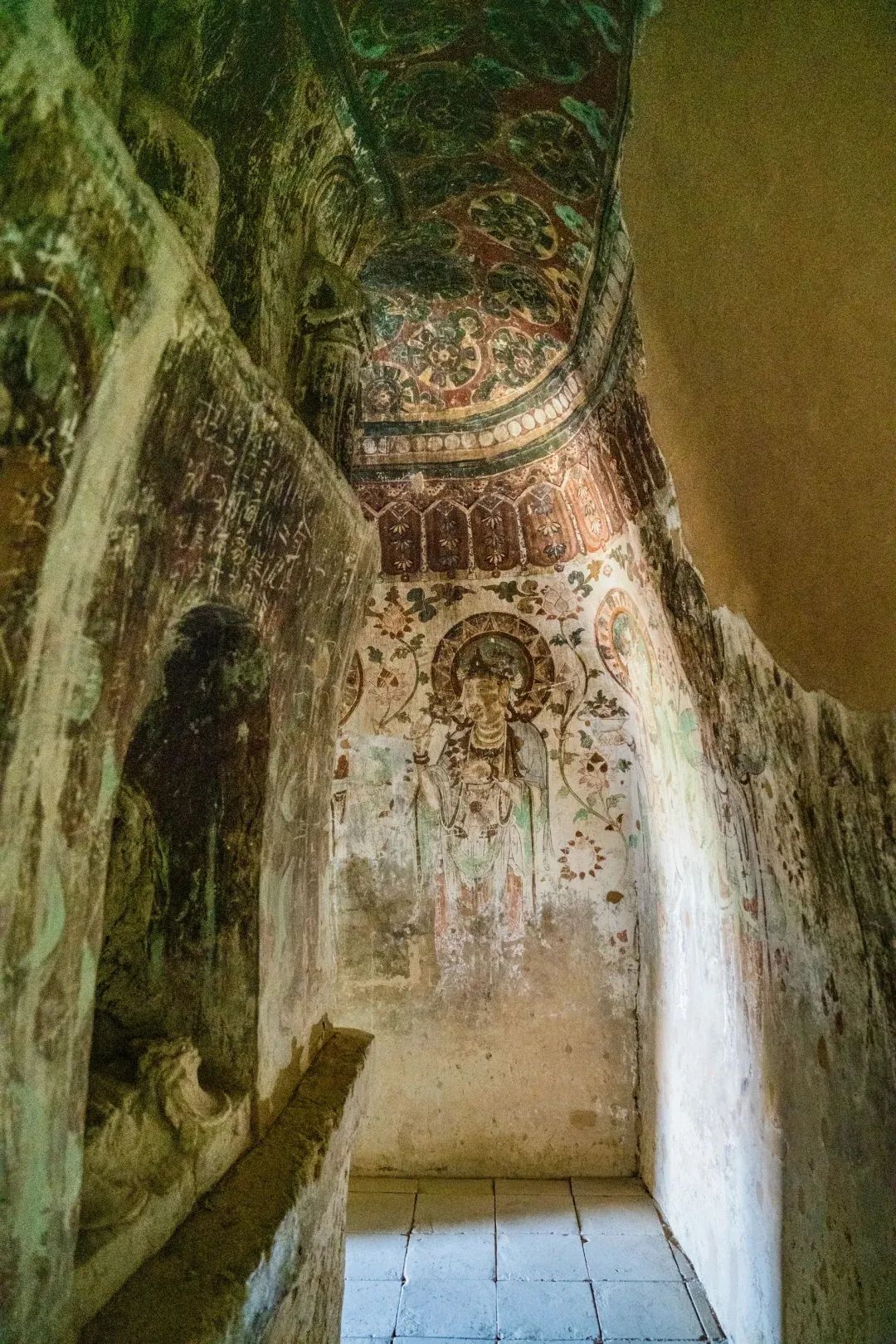 昌馬石窟第4窟洞窟形制及其殘存的塑像對(duì)于研究中國(guó)早期石窟藝術(shù)與佛教造像藝術(shù)極其重要??邇?nèi)壁畫(huà)內(nèi)容是四壁上方畫(huà)條式旌幡,下畫(huà)供養(yǎng)菩薩,身高近2米,今殘存20身,菩薩周?chē)?huà)纏枝蓮,與第二窟基本相同。窟頂前半部地仗大部分脫落,靠近中心柱正面上部右側(cè)的部位殘存龜形六瓣團(tuán)花圖案與一身飛天及菊花紋圖案。后部中心柱頂部周?chē)唔敱砻胬L龜形六瓣團(tuán)花、連珠紋等圖案。