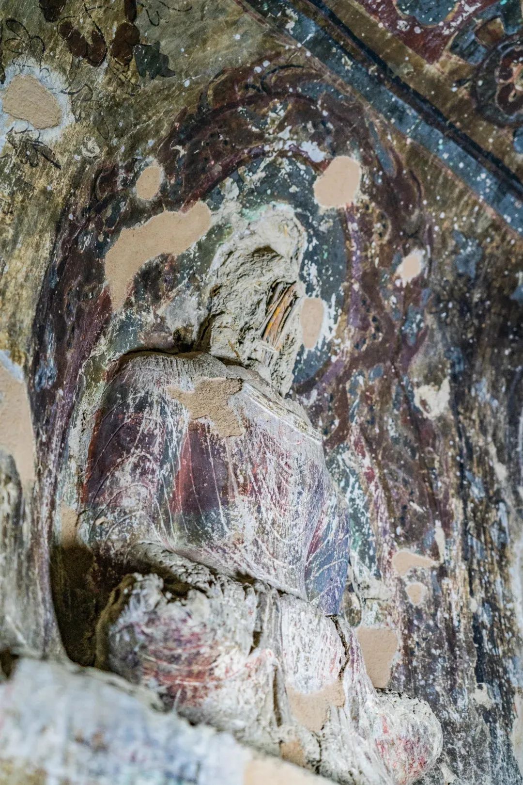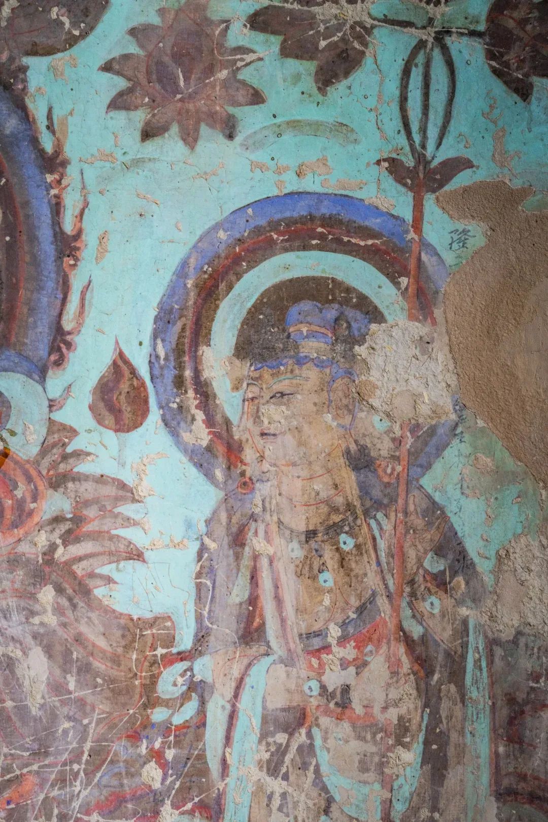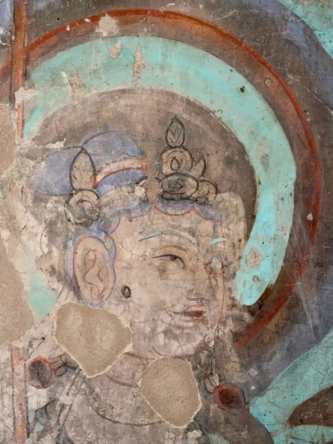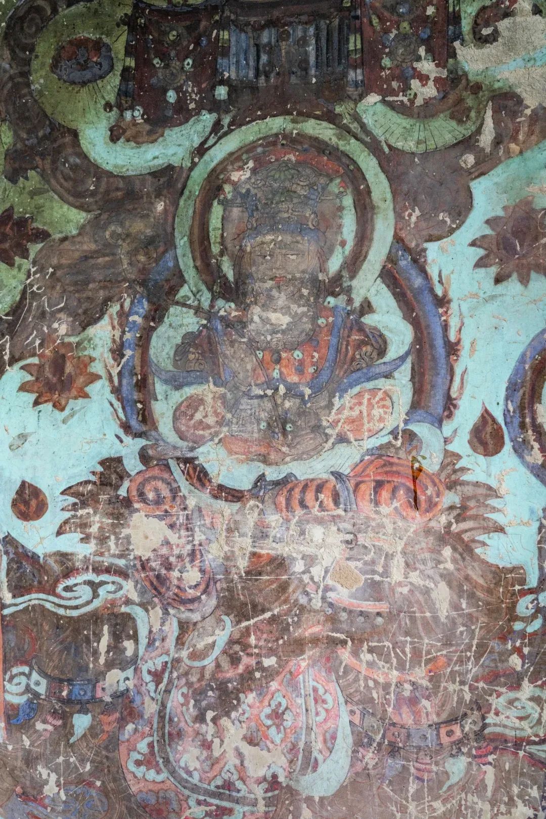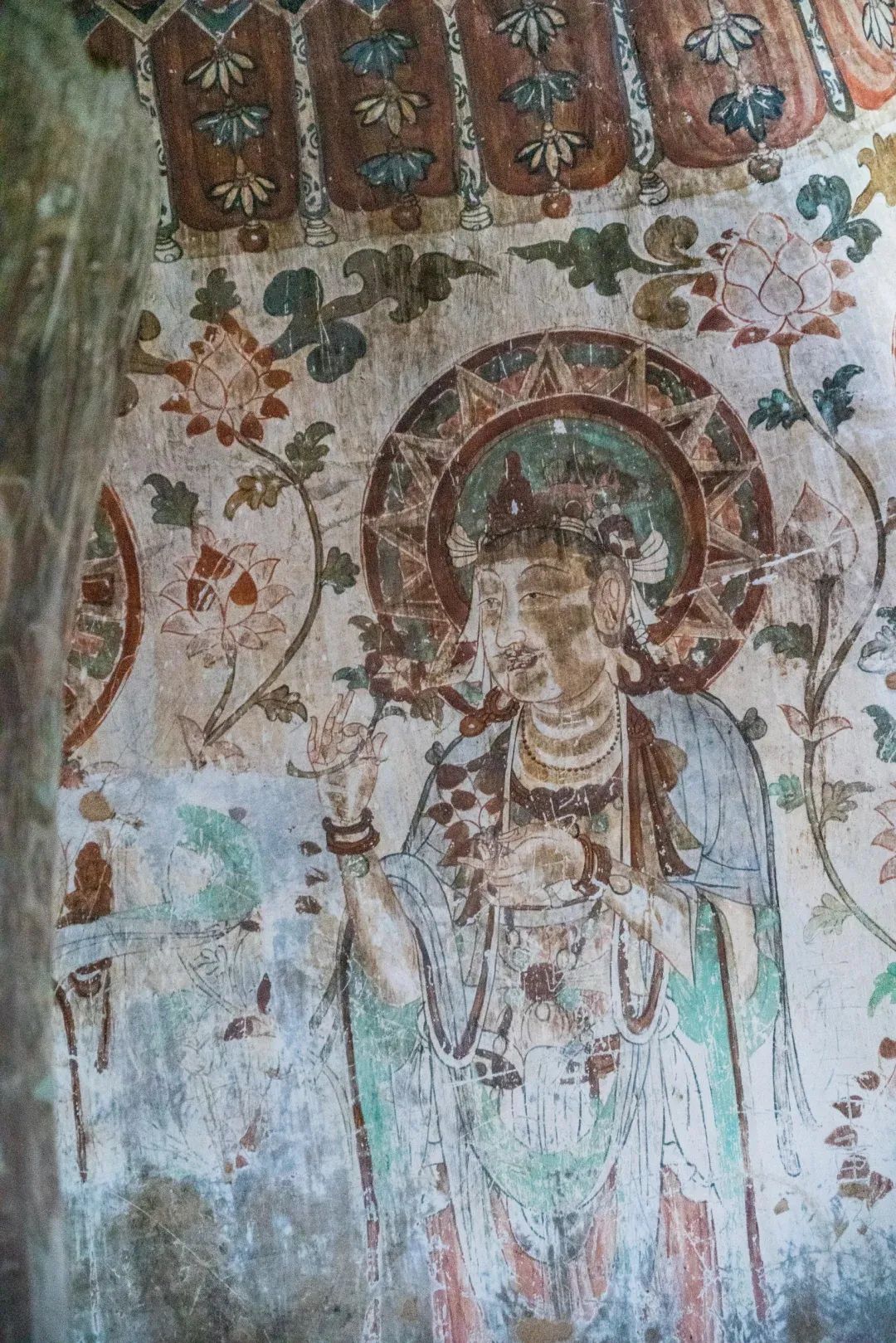 昌馬石窟第4窟洞窟形制及其殘存的塑像對(duì)于研究中國(guó)早期石窟藝術(shù)與佛教造像藝術(shù)極其重要??邇?nèi)壁畫(huà)內(nèi)容是四壁上方畫(huà)條式旌幡,下畫(huà)供養(yǎng)菩薩,身高近2米,今殘存20身,菩薩周?chē)?huà)纏枝蓮,與第二窟基本相同。窟頂前半部地仗大部分脫落,靠近中心柱正面上部右側(cè)的部位殘存龜形六瓣團(tuán)花圖案與一身飛天及菊花紋圖案。后部中心柱頂部周?chē)唔敱砻胬L龜形六瓣團(tuán)花、連珠紋等圖案。