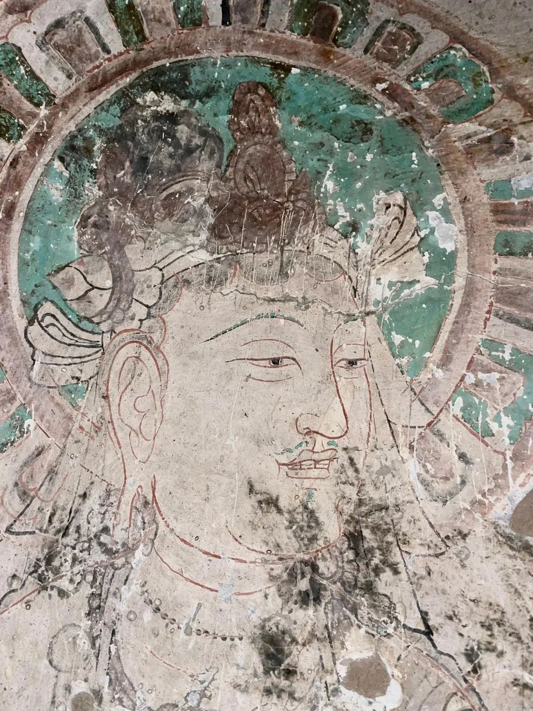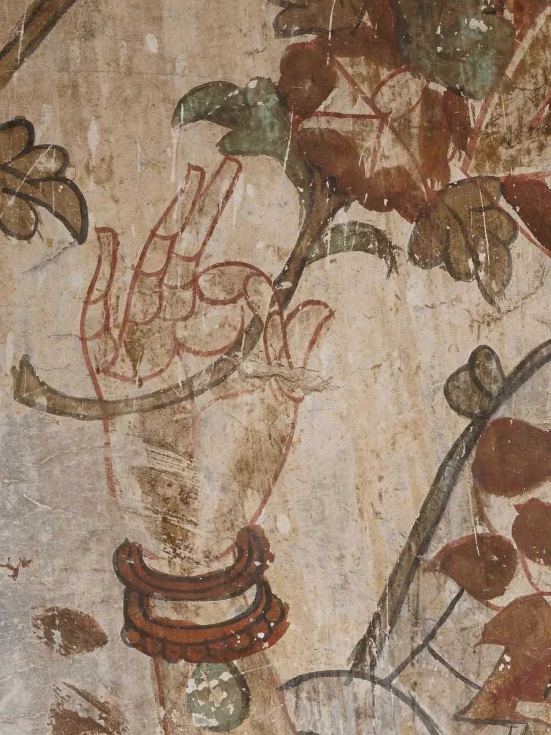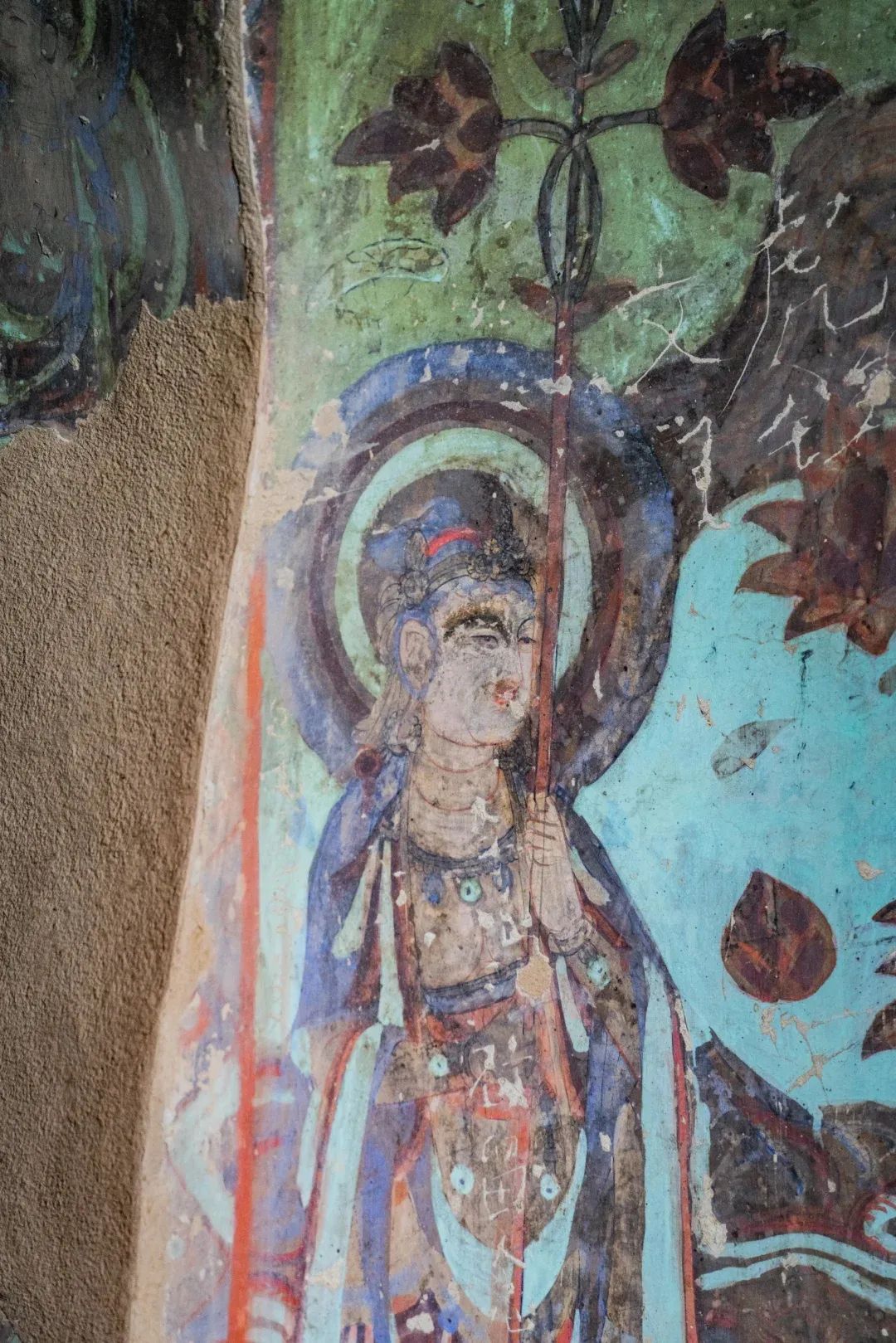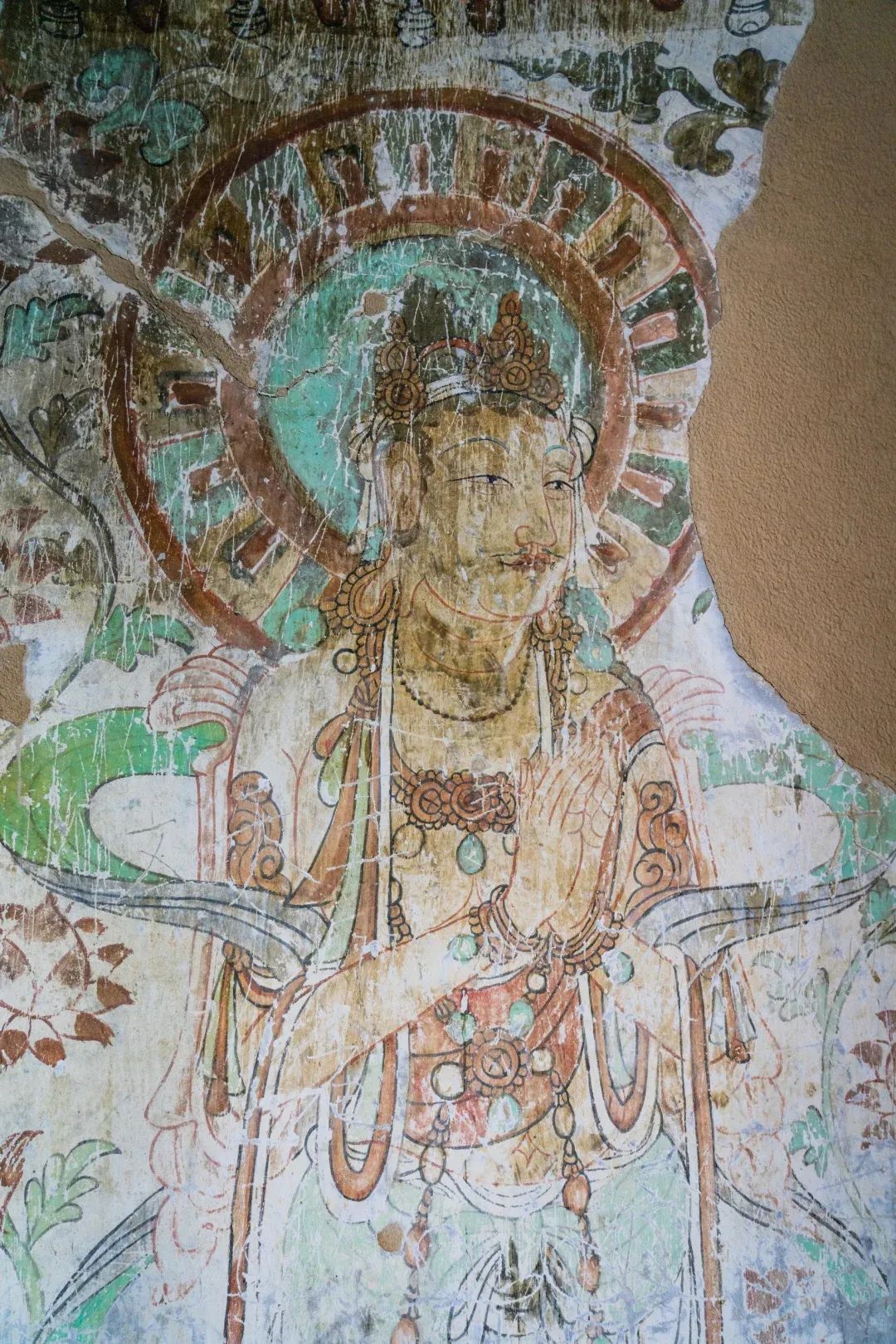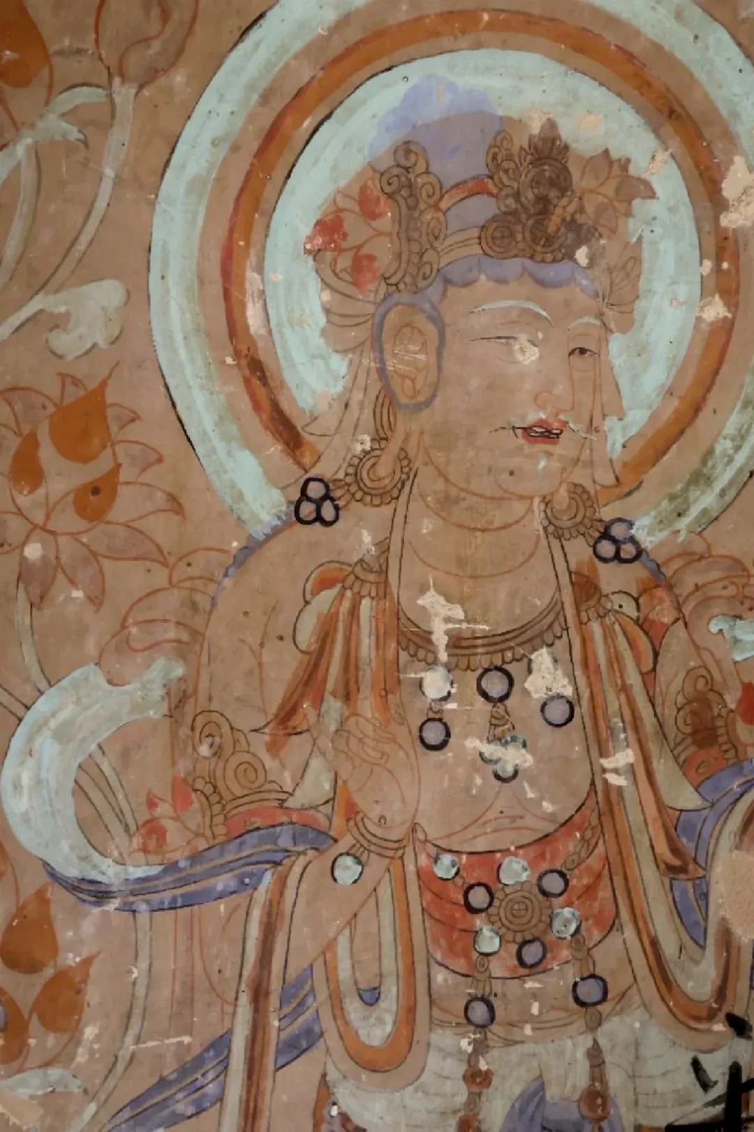 昌馬石窟第4窟洞窟形制及其殘存的塑像對(duì)于研究中國(guó)早期石窟藝術(shù)與佛教造像藝術(shù)極其重要??邇?nèi)壁畫(huà)內(nèi)容是四壁上方畫(huà)條式旌幡,下畫(huà)供養(yǎng)菩薩,身高近2米,今殘存20身,菩薩周?chē)?huà)纏枝蓮,與第二窟基本相同。窟頂前半部地仗大部分脫落,靠近中心柱正面上部右側(cè)的部位殘存龜形六瓣團(tuán)花圖案與一身飛天及菊花紋圖案。后部中心柱頂部周?chē)唔敱砻胬L龜形六瓣團(tuán)花、連珠紋等圖案。
