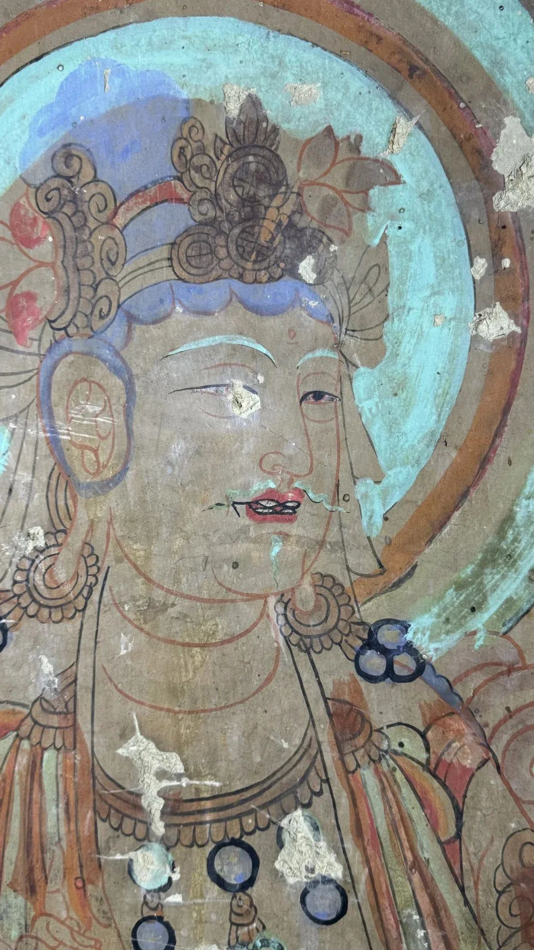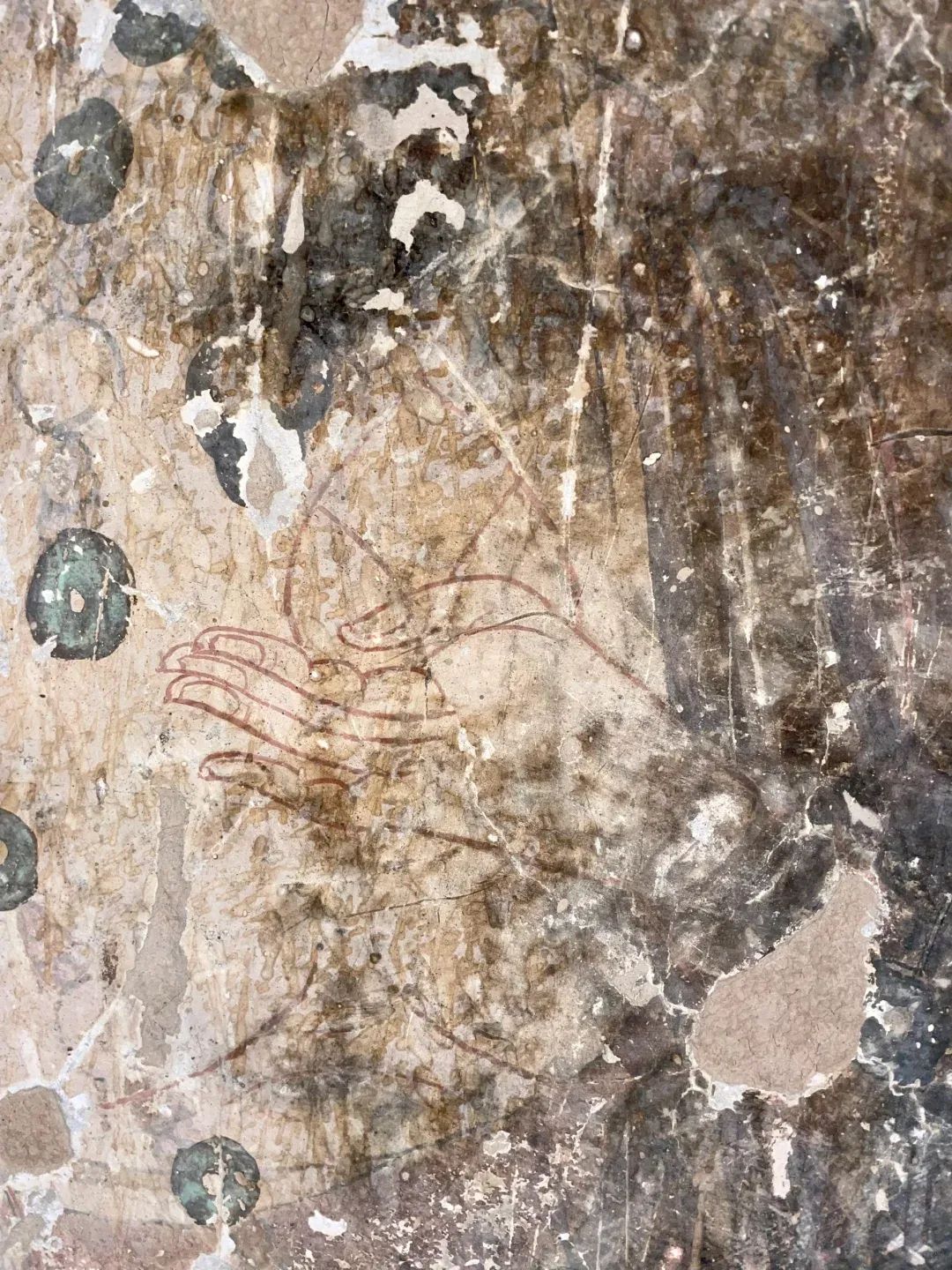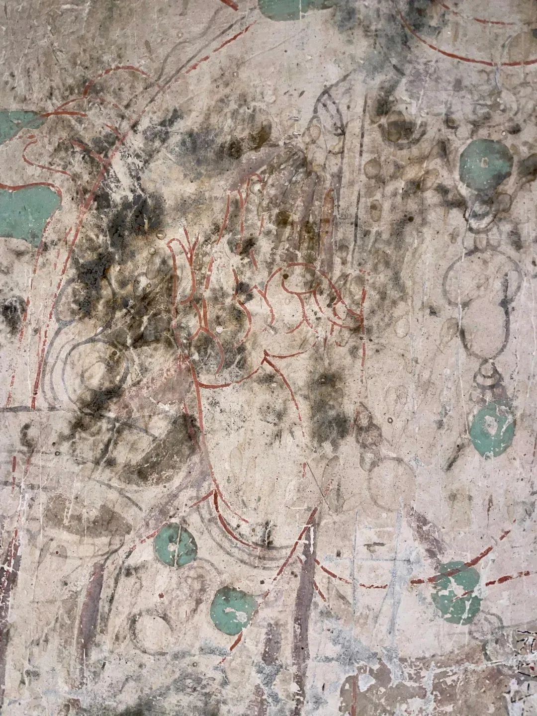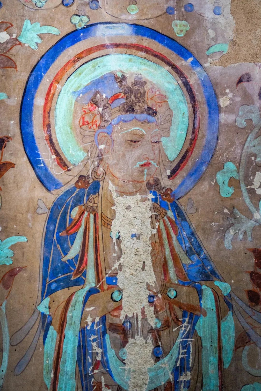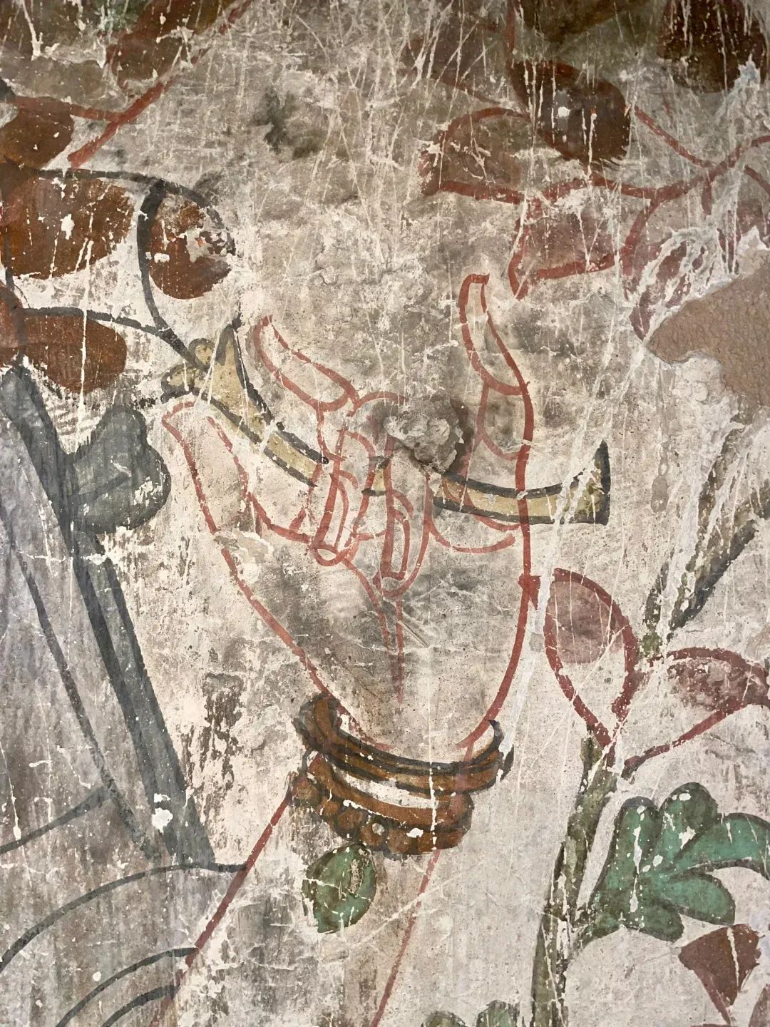 昌馬石窟第4窟洞窟形制及其殘存的塑像對(duì)于研究中國(guó)早期石窟藝術(shù)與佛教造像藝術(shù)極其重要??邇?nèi)壁畫(huà)內(nèi)容是四壁上方畫(huà)條式旌幡,下畫(huà)供養(yǎng)菩薩,身高近2米,今殘存20身,菩薩周?chē)?huà)纏枝蓮,與第二窟基本相同。窟頂前半部地仗大部分脫落,靠近中心柱正面上部右側(cè)的部位殘存龜形六瓣團(tuán)花圖案與一身飛天及菊花紋圖案。后部中心柱頂部周?chē)唔敱砻胬L龜形六瓣團(tuán)花、連珠紋等圖案。