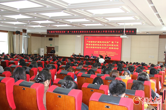 18日下午,由國家圖書館(國家古籍保護(hù)中心)主辦,甘肅省圖書館(甘肅省古籍保護(hù)中心)與西北民族大學(xué)聯(lián)合承辦的“古籍保護(hù)課程進(jìn)校園”活動(dòng)暨“甘肅省古籍修復(fù)技藝傳習(xí)點(diǎn)”授牌活動(dòng)在西北民族大學(xué)舉行。