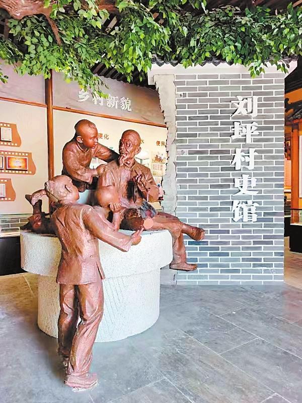 年復一年的寒來暑往中,大榆樹,也就成了劉坪村的望鄉(xiāng)臺。每個村莊,都有它的望鄉(xiāng)臺,它承載著人們共同的記憶,是人們重溫鄉(xiāng)愁的地標,永遠鐫刻在人們的心底。2000年,電視劇《黃沙下面是沃土》的劇組來到劉坪村拍攝取景,村里的望鄉(xiāng)臺大榆樹被拍進電視劇畫面。在劉坪村村史館布設中,專家和學者數(shù)易村史館方案,最終確定在村史館正門之內塑造一組雕塑,意思是由一位老人講述劉坪村的村史,作為村史館的題眼,村史館內還陳列了《劉坪村志》,分為建置、地理、村落文化、風土人情等14卷,共40萬字。館內能播放劉坪村村史專題片《耕讀傳家》。