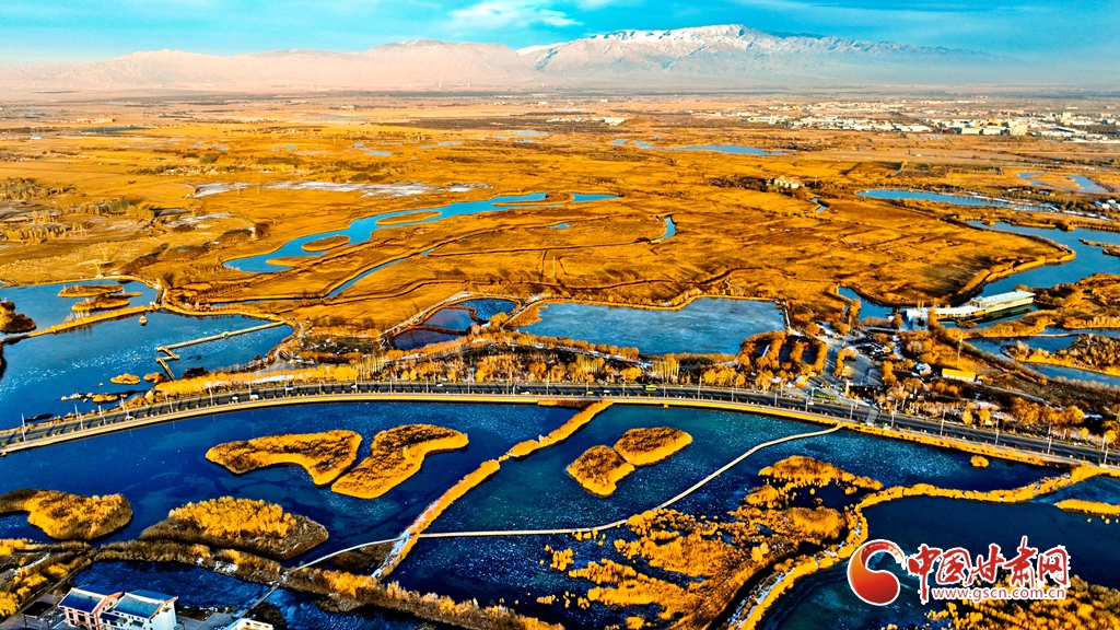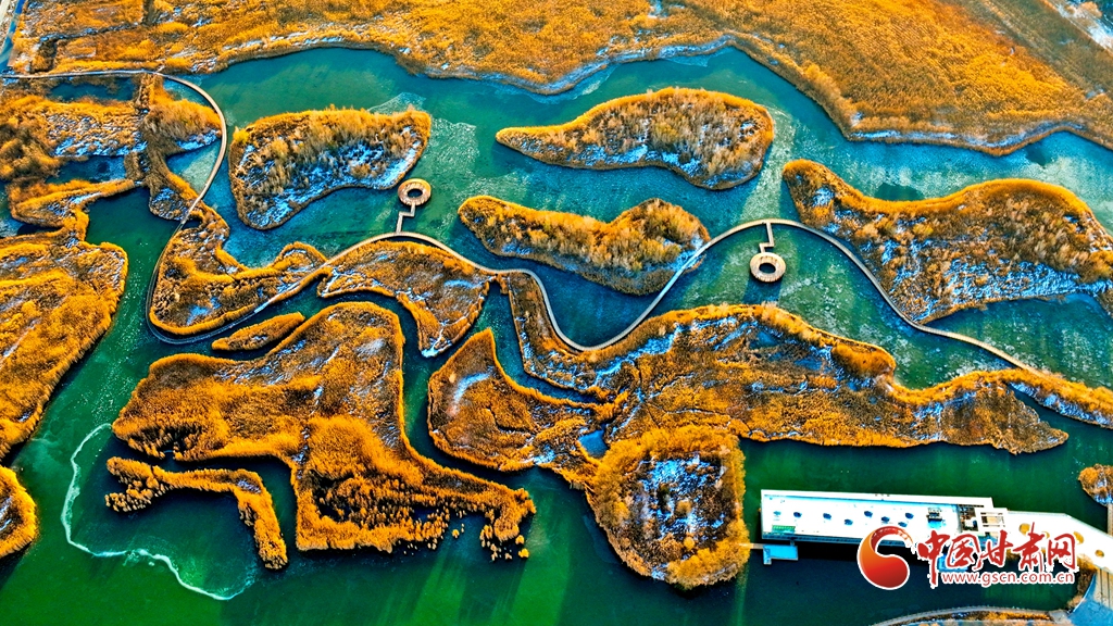 12月1日,俯瞰甘肅張掖國家濕地公園,夕陽余暉映照,金色茂密的蘆葦隨風(fēng)搖曳,蘆花翩翩起舞,碧波蕩漾的水面逐漸凝結(jié)成冰,整個濕地化作一片金色的童話仙境,令人陶醉于無盡的遐想之中。