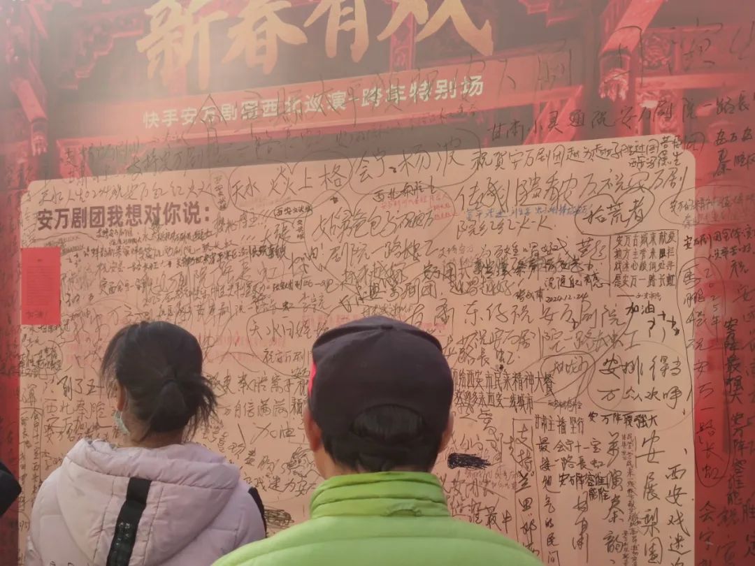 5年后,安萬帶著他的劇團(tuán)來到西安,展板上寫滿了戲迷們對安萬的祝語。
