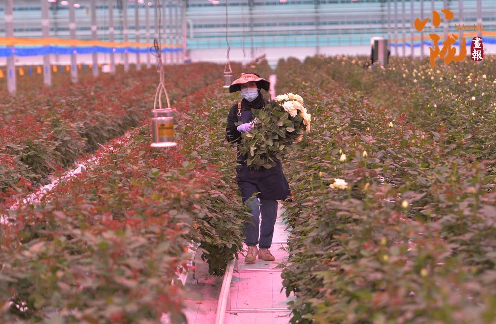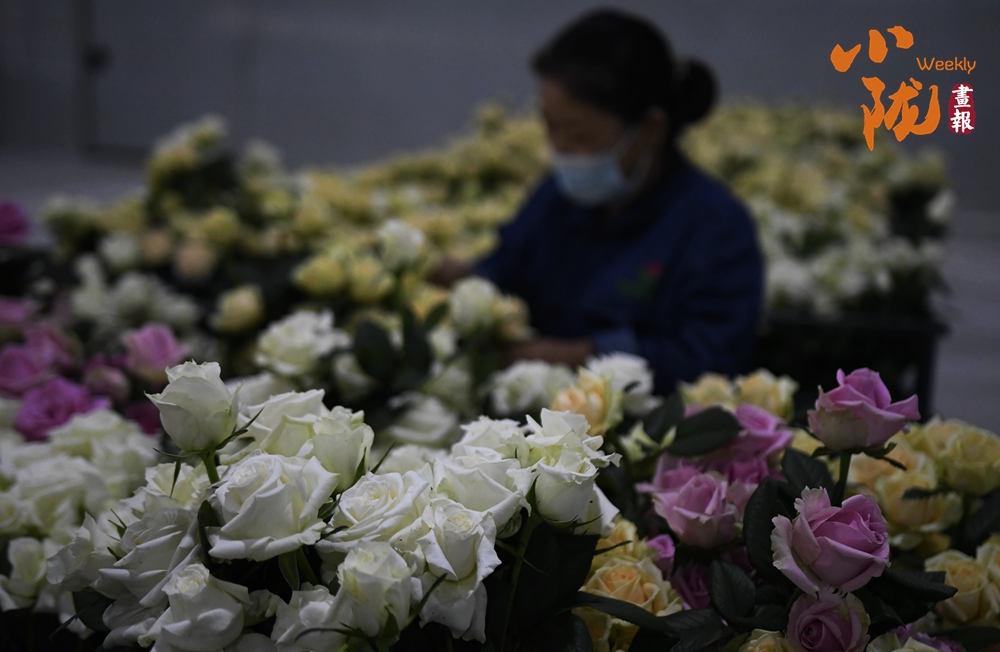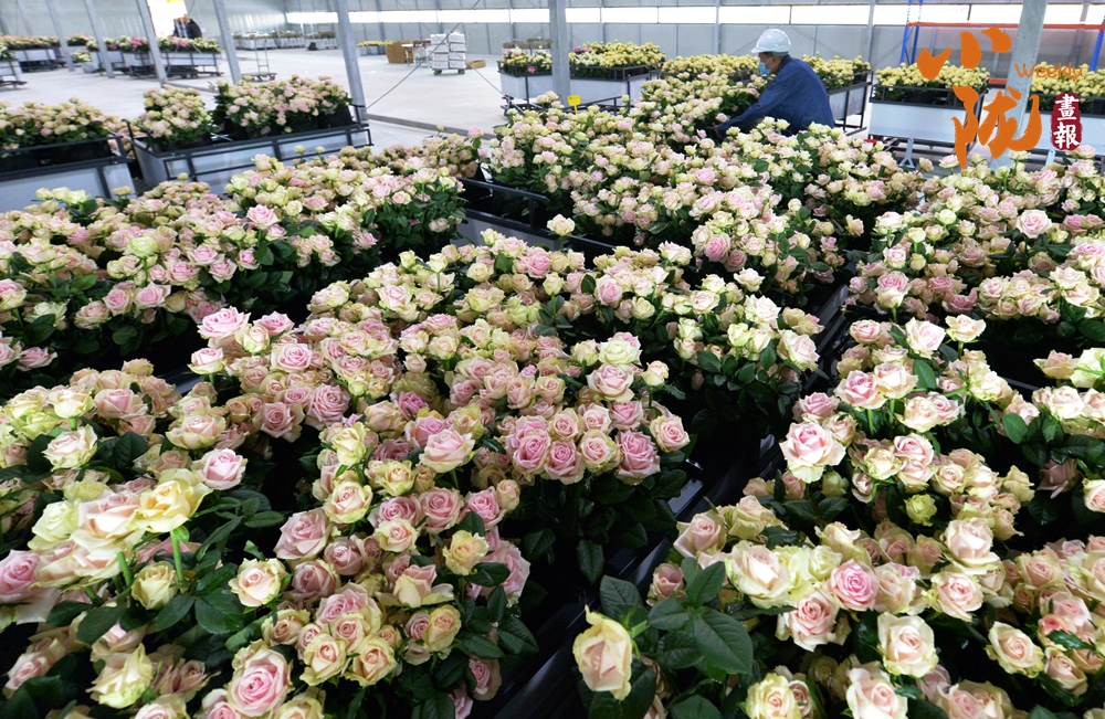 工作人員忙著采摘、分揀、包裝,一束束鮮切玫瑰從這里搭乘冷鏈物流,不僅暢銷國內,還遠銷海外,成為“一帶一路”上一張靚麗的名片。