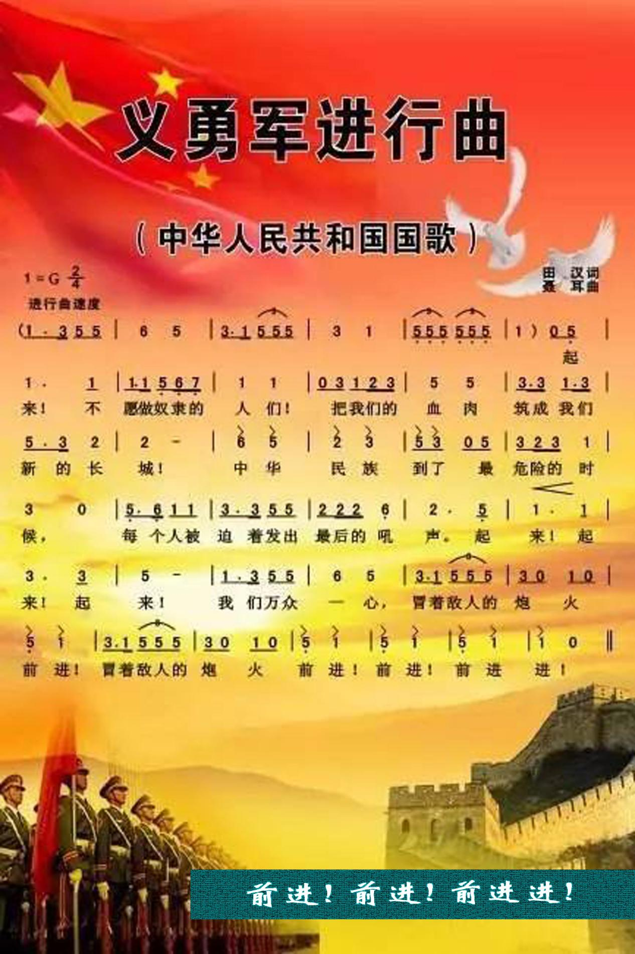 ⑧前進(jìn)!前進(jìn)!前進(jìn)進(jìn)?。骸读x勇軍進(jìn)行曲》這一段歌詞是作曲家聶耳改定的。為了使歌曲曲調(diào)和節(jié)奏更加有力,聶耳把田漢原來的“我們?nèi)f眾一心,冒著敵人的飛機(jī)大炮前進(jìn)。前進(jìn)!前進(jìn)!前進(jìn)!”改為“我們?nèi)f眾一心,冒著敵人的炮火,前進(jìn)!冒著敵人的炮火,前進(jìn)!前進(jìn)!前進(jìn)進(jìn)!”全國(guó)政協(xié)委員、國(guó)家一級(jí)指揮、解放軍軍樂團(tuán)前團(tuán)長(zhǎng)于海曾談到:“前進(jìn),前進(jìn),前進(jìn)進(jìn)!”這七個(gè)字堪稱國(guó)歌的點(diǎn)睛之筆。“前進(jìn)進(jìn)”的節(jié)奏感,凸顯了國(guó)歌精神的進(jìn)行時(shí)態(tài)。正是這種精神一直在指引我們,激勵(lì)著我們。