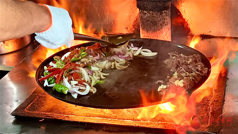 如今,炒撥拉已經(jīng)成為山丹人日常生活中不可或缺的一部分。在焉支巷子,游客可以看到多家炒撥拉店,每家店都有其獨(dú)特的炒制技藝和風(fēng)味。店家將切好的羊肝、肺、肚、腸、心等佐以洋蔥、青椒下入一個(gè)鑄鐵鏊子里,再加上幾勺鹽和辣椒面,開始用猛火爆炒?;鹦撬臑R,一頓撥拉之后,待到七分熟左右再放入提前準(zhǔn)備好的白餅塊一起翻炒即可。不一會(huì)兒,一鍋美味可口、熱熱乎乎的炒撥拉就制作完成了。
