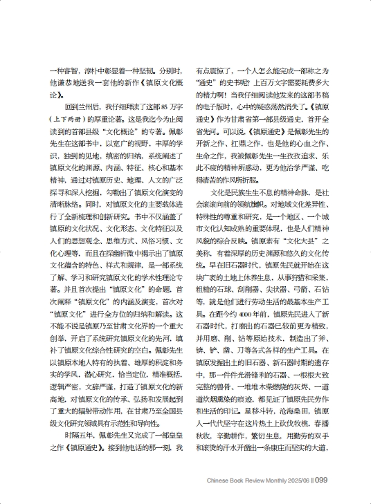 回到蘭州后,我仔細拜讀了這部85萬字(上下兩冊)的厚重論著。這是我迄今為止閱讀到的首部縣級“文化概論”的專著。佩彰先生在這部書中,以寬廣的視野,豐厚的學識,獨到的見地,縝密的歸納,系統(tǒng)闡述了鎮(zhèn)原文化的淵源、內涵、特征、核心和基本精神,通過對鎮(zhèn)原歷史、地理、人文的廣泛探尋和深入挖掘,勾勒出了鎮(zhèn)原文化演變的清晰脈絡。同時,對鎮(zhèn)原文化的主要載體進行了全新梳理和創(chuàng)新研究。書中不僅涵蓋了鎮(zhèn)原的文化狀況、文化形態(tài)、文化特征以及人們的思想觀念、思維方式、風俗習慣、文化心理等,而且在探幽析微中揭示出了鎮(zhèn)原文化蘊含的特色、樣式和規(guī)律,是一部系統(tǒng)了解、學習和研究鎮(zhèn)原文化的學術性理論專著。并且首次提出“鎮(zhèn)原文化”的命題,首次闡釋“鎮(zhèn)原文化”的內涵及演變,首次對“鎮(zhèn)原文化”進行全方位的歸納和解讀。這不能不說是鎮(zhèn)原乃至甘肅文化界的一個重大創(chuàng)舉,開啟了系統(tǒng)研究鎮(zhèn)原文化的先河,填補了鎮(zhèn)原文化綜合性研究的空白。佩彰先生以鎮(zhèn)原本地人特有的執(zhí)著、雄厚的積淀和務實的學風,潛心研究,恰當定位,精準概括,邏輯嚴密,文辭嚴謹,打造了鎮(zhèn)原文化的新高地,對鎮(zhèn)原文化的傳承、弘揚和發(fā)展起到了重大的輻射帶動作用,在甘肅乃至全國縣級文化研究領域具有示范性和導向性。