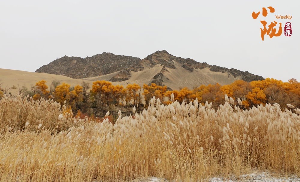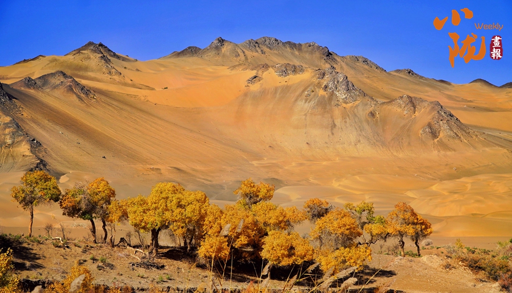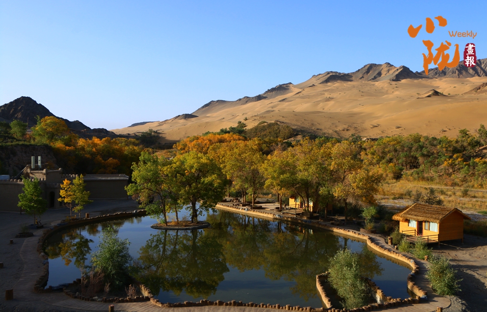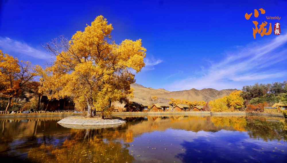 連綿起伏的沙丘如金色浪潮,環(huán)抱著一汪碧水,藍天白云倒映其中。金黃的胡楊在秋風中輕輕搖曳,宛如一群身著華麗服飾的衛(wèi)士,默默守護著這片沙漠中的綠洲。
