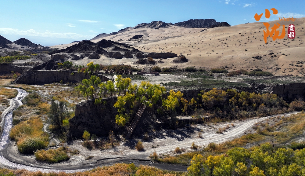 這里山勢奇特,因溝深線長,猶如峽谷,溝邊自生許多胡楊,被稱為“胡楊峽”。你看,溝邊沙山林立,千年胡楊挺拔,溝內(nèi)溪水清澈纏綿,天然的紅柳、蘆葦、梭梭、沙棗樹等植被錯落有致,共同繪就了一幅秋日畫卷。