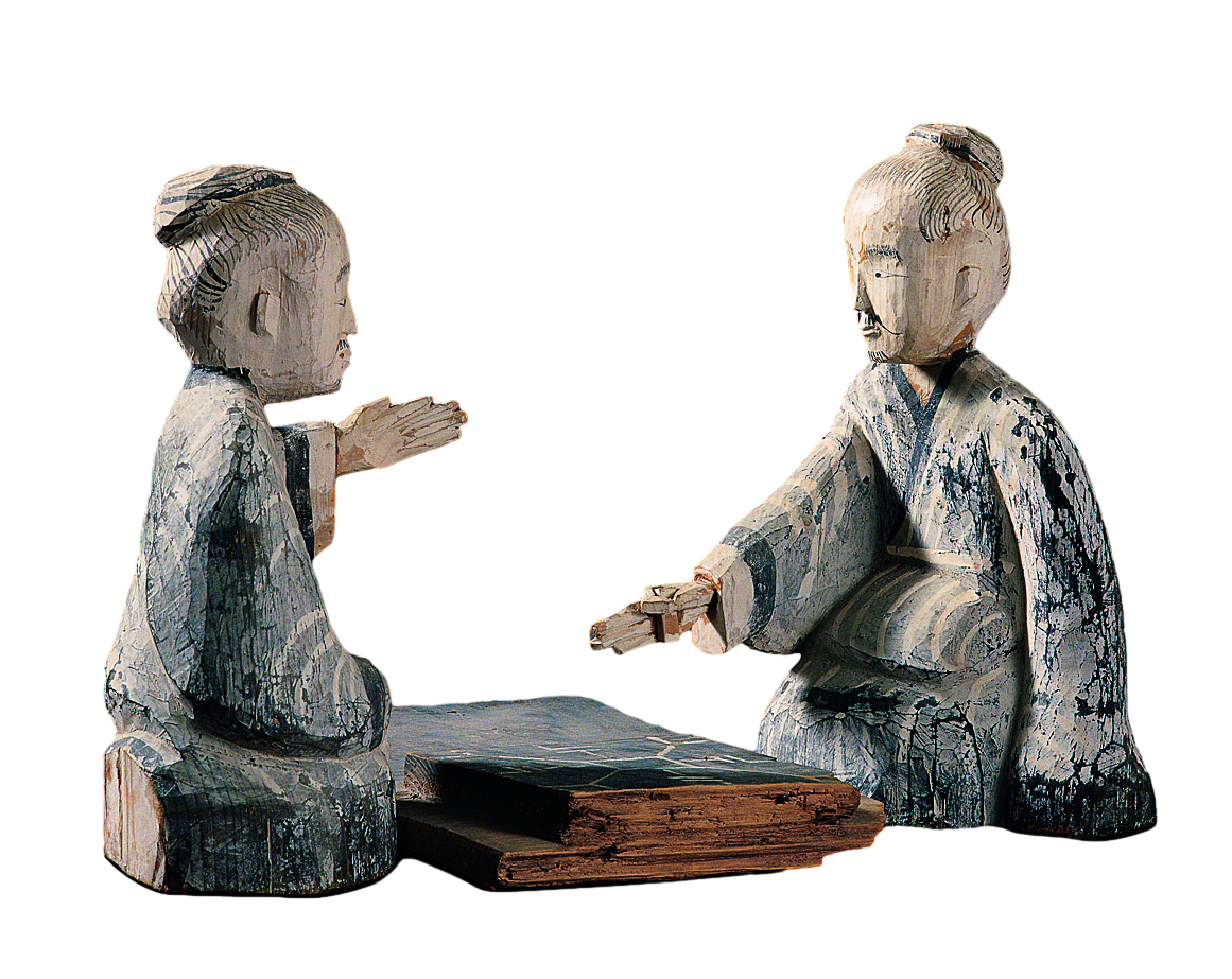 漢代 武威市磨嘴子漢墓出土 人高29厘米。 兩位老者在玩博戲,這是戰(zhàn)國到漢代非常盛行的一種娛樂形式。匠師以簡單明快的藝術(shù)造型,刻畫了兩位老者全神貫注的博弈,惟妙惟肖地表現(xiàn)出對弈時蓄勢待發(fā)的場面。