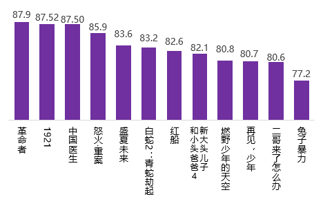 調(diào)查顯示,《革命者》《1921》《中國(guó)醫(yī)生》三部影片的滿意度得分分別為87.9分、87.52分、87.50分,分列2021年暑期檔影片滿意度排序的前三位。動(dòng)作片《怒火·重案》、青春片《盛夏未來》和動(dòng)畫片《白蛇2:青蛇劫起》滿意度居檔期第4至6位。
