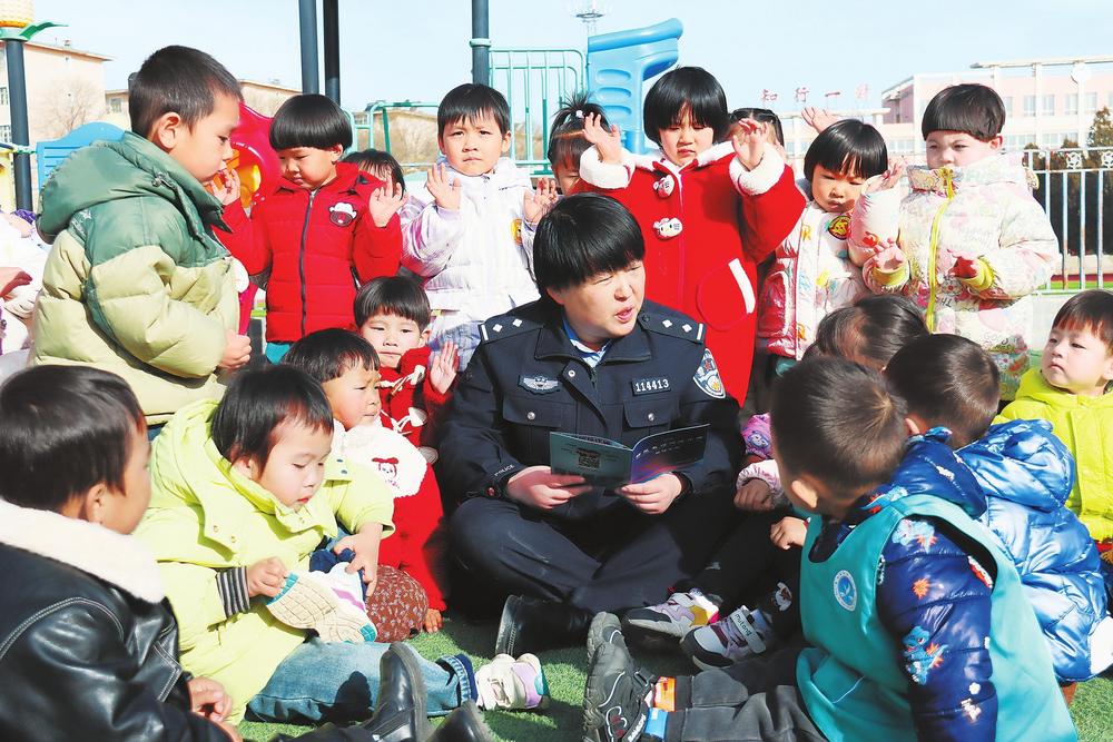 民警向小朋友講解法律知識。3月3日,隴西縣公安局西郊派出所民輔警走進幼兒園,開展法治宣傳和安全教育。新甘肅·甘肅法治報通訊員朱艷霞攝