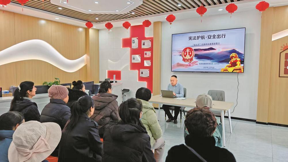律師在社區(qū)開展“憲法護(hù)航·安全出行”主題普法講座。