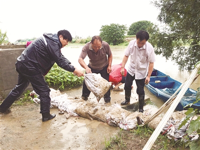 7月13日,江蘇省宜興市丁蜀鎮(zhèn)紀(jì)檢干部到該鎮(zhèn)雙廟村防汛一線(xiàn),在督促履行抗洪搶險(xiǎn)職責(zé)的同時(shí),與當(dāng)?shù)馗刹咳罕娨坏兰庸毯拥?。毛光?nbsp;攝