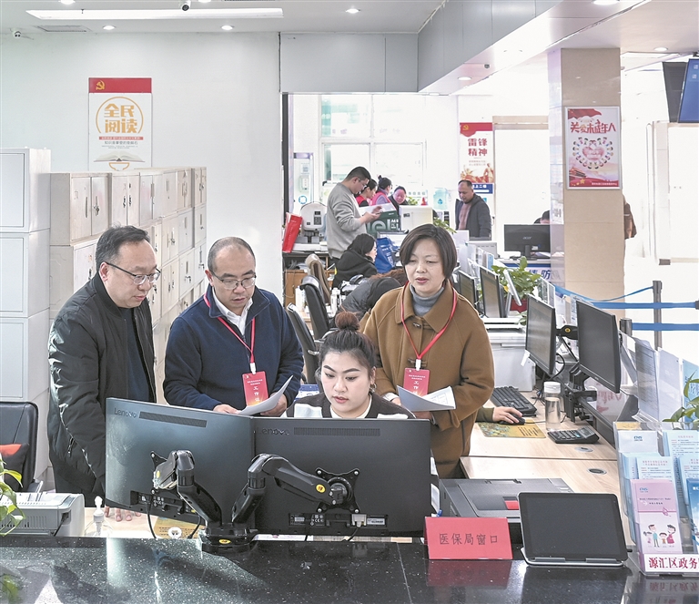 河南省漯河市源匯區(qū)紀(jì)委監(jiān)委聚焦醫(yī)保基金安全運(yùn)行等關(guān)鍵環(huán)節(jié)開展專項(xiàng)整治,督促主管部門著力整治醫(yī)?;鸸芾碇刑搱?bào)冒領(lǐng)、騙取套取等違紀(jì)違法行為,嚴(yán)肅查處監(jiān)管失職失責(zé)及背后的不正之風(fēng)和腐敗問題。圖為近日,該區(qū)紀(jì)委監(jiān)委工作人員到區(qū)行政服務(wù)中心醫(yī)保局窗口走訪核實(shí)相關(guān)情況。尤亞輝 攝