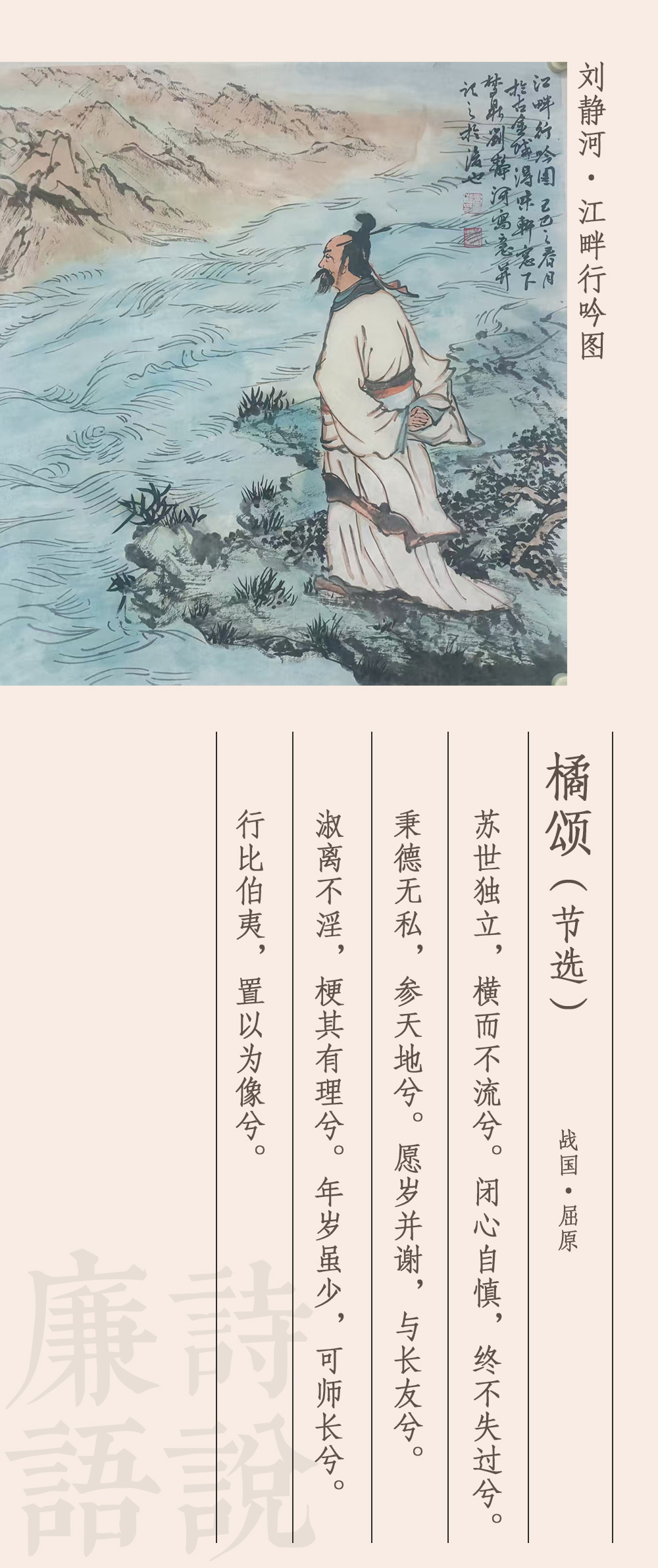 《橘頌》被譽(yù)為中國(guó)最早的詠物詩(shī)。據(jù)考證,屈原在流放之初,苦悶憤激,看到南國(guó)的橘樹(shù),心有所觸,將橘樹(shù)人格化,賦予其君子仁人的品格,寫(xiě)下了這首詩(shī)。詩(shī)分兩部分,前半部分寫(xiě)實(shí),刻畫(huà)了橘樹(shù)的生長(zhǎng)習(xí)性和枝葉花果,后半部分抒情議論,托物言志,橘人合一,情景交融。這里節(jié)選了后半部分,大意如下:清醒立世啊不隨波逐流,小心謹(jǐn)慎啊過(guò)失從不留,沒(méi)有私欲啊與天地比儔,我與你同生死啊永結(jié)為好友,你形象美好啊耿直作一流,你風(fēng)華正茂啊堪為好師長(zhǎng),你高潔比伯夷啊榜樣最優(yōu)秀。