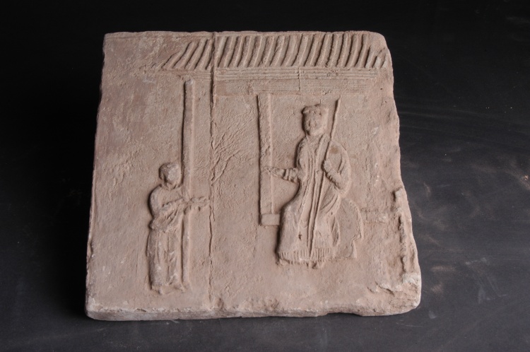 宋代??v30.2厘米,橫30.7厘米,厚3厘米。征集。磚呈長方形,青灰色,通過模印工藝展示了屋檐下一婦人坐于窗臺前,給一端物的幼子訓話的場景,是研究宋代社會生活、家庭倫理及畫像磚藝術(shù)的珍貴實物資料。