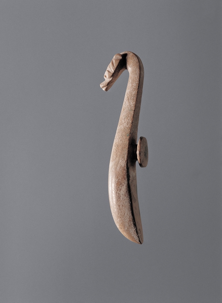 漢代,武威市雷臺漢墓出土。長10厘米,寬1.5厘米,厚2.7厘米。青玉,淺浮雕。鉤首雕成龍頭形,高而窄,鉤肚圓鼓,背有一圓鈕。帶鉤是古代服飾配件,兼有實(shí)用和裝飾的雙重作用,材質(zhì)多樣,工藝繁簡各異。