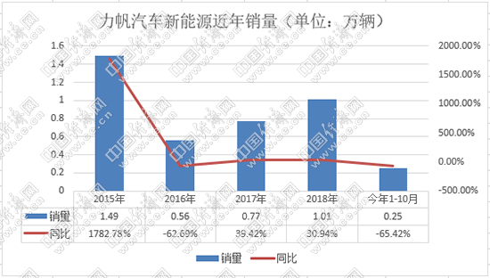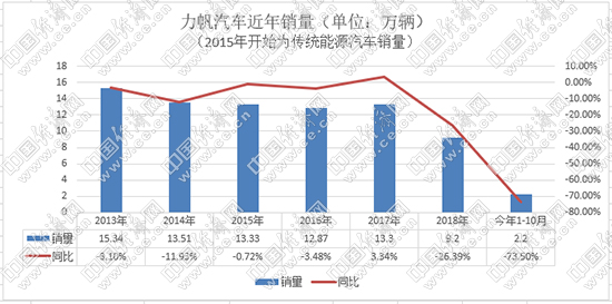 2006年,力帆推出首款轎車力帆520,新車不足5萬元的售價(jià)在當(dāng)時(shí)引發(fā)關(guān)注,月銷量一度達(dá)到5000輛。2013年,力帆年銷售汽車15.34萬輛,成為汽車界的一匹黑馬。然而,好景不長。自2016年開始,力帆汽車進(jìn)入下行趨勢,目前更是步履維艱。力帆產(chǎn)銷快報(bào)顯示,2019年1-10月,力帆傳統(tǒng)乘用車?yán)塾?jì)銷售2.2萬輛,同比下滑73.5%,10月僅銷售29輛;新能源累計(jì)銷售2458輛,同比下降65.42%,10月僅銷售423輛。