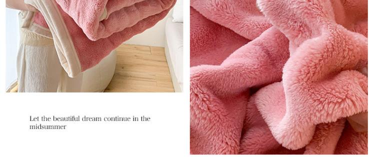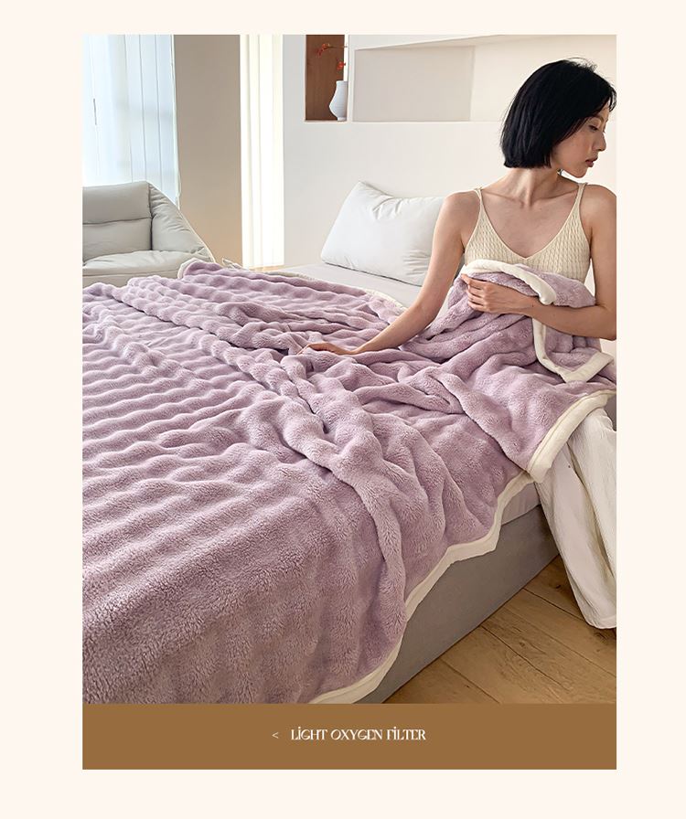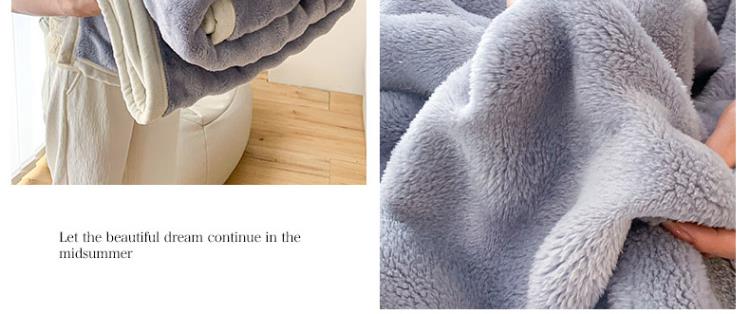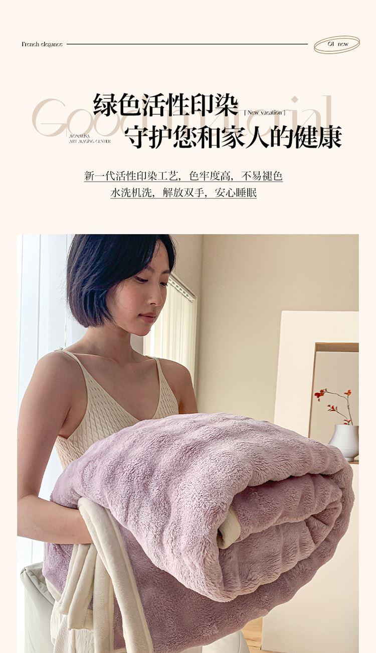 A類母嬰級面料標(biāo)準(zhǔn),無甲醛、無芳香胺、無熒光劑;高克重雙面牛奶絨,絨毛豐盈密實(shí),手感輕盈厚實(shí),升溫鎖溫快;面料中加入導(dǎo)電絲,減少空氣中微分子摩擦產(chǎn)生的靜電,無懼靜電煩惱;新一代活性印染,色牢度高,不易褪色,水洗機(jī)洗解放雙手; 可用作睡眠蓋毯,床蓋、辦公室午睡毯、空調(diào)休閑毯、車載蓋毯、兒童墊毯、居家裝飾毯;加厚保暖升溫迅速,且能牢牢鎖溫。