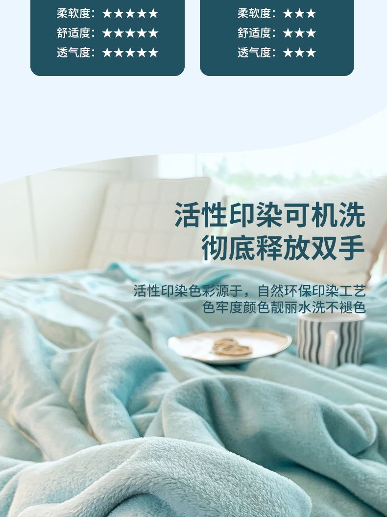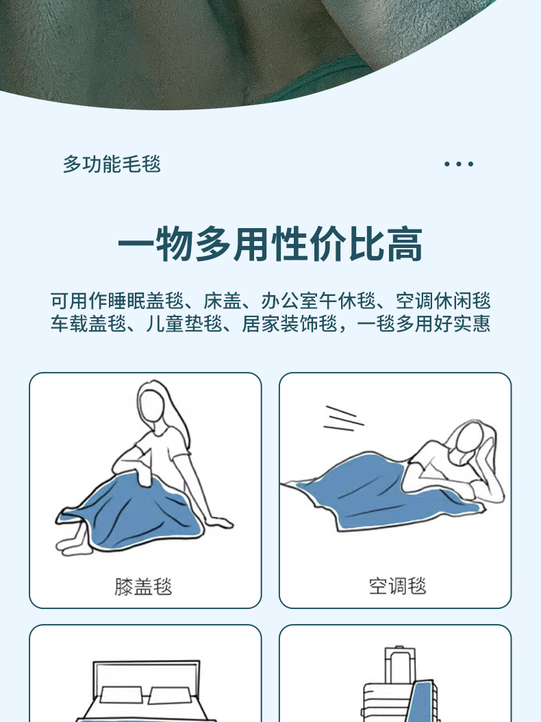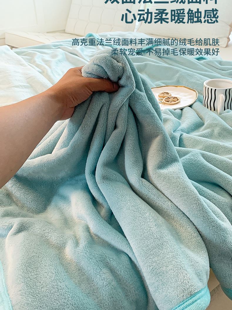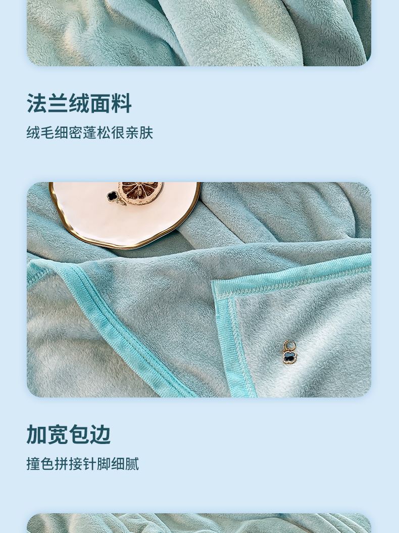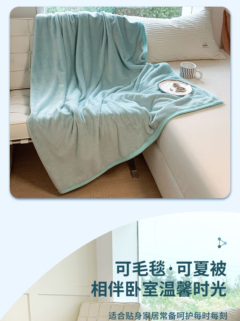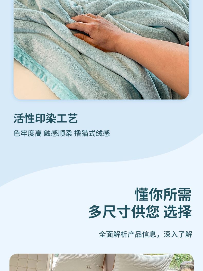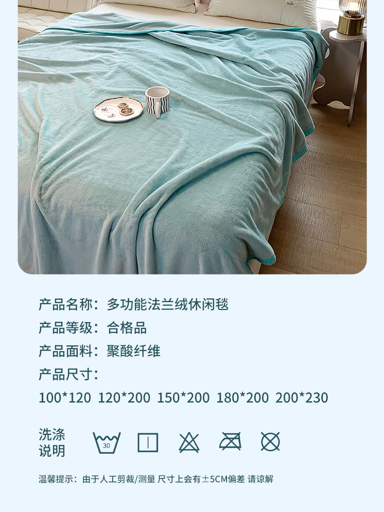 高克重法蘭絨毛毯,絨毛細(xì)密平整,貼身柔軟舒適;面料加入導(dǎo)電絲纖維有效防止靜電;絨面平整,色牢度高,不易掉毛;多功能毛毯,可用作睡眠蓋毯,床蓋、辦公室午睡毯、空調(diào)休閑毯、車載蓋毯、兒童墊毯、居家裝飾毯;加厚保暖升溫迅速,且能牢牢鎖溫。