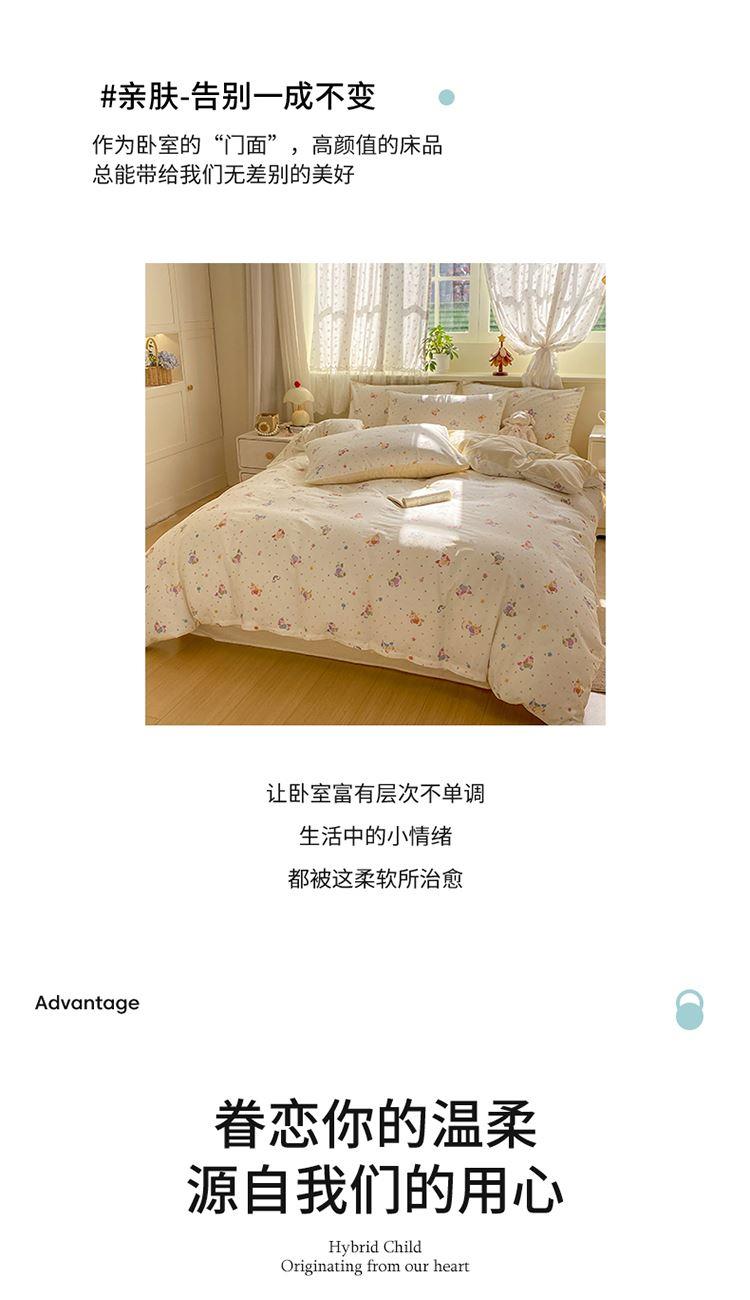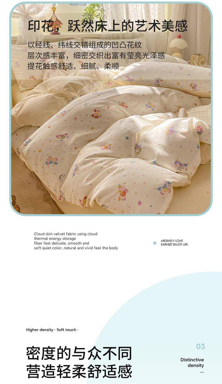 1:全棉面料柔到你心里 更貼身、吸濕、透氣,保暖松軟的觸感,躺進(jìn)去世界也變得柔軟 2:印花,躍然床上的藝術(shù)美感 以經(jīng)線、緯線交錯(cuò)組成的凹凸花紋 層次感豐富,細(xì)密交織出富有瑩亮光澤感提花觸感舒適、細(xì)膩、柔順 3:密度的與眾不同營(yíng)造輕柔舒適感 紗織越細(xì),面料越柔軟,床品品質(zhì)也就 尺寸:被套200*230cm*1 床單:230*250cm*1 枕套:48*74cm*2 包裝:彩盒