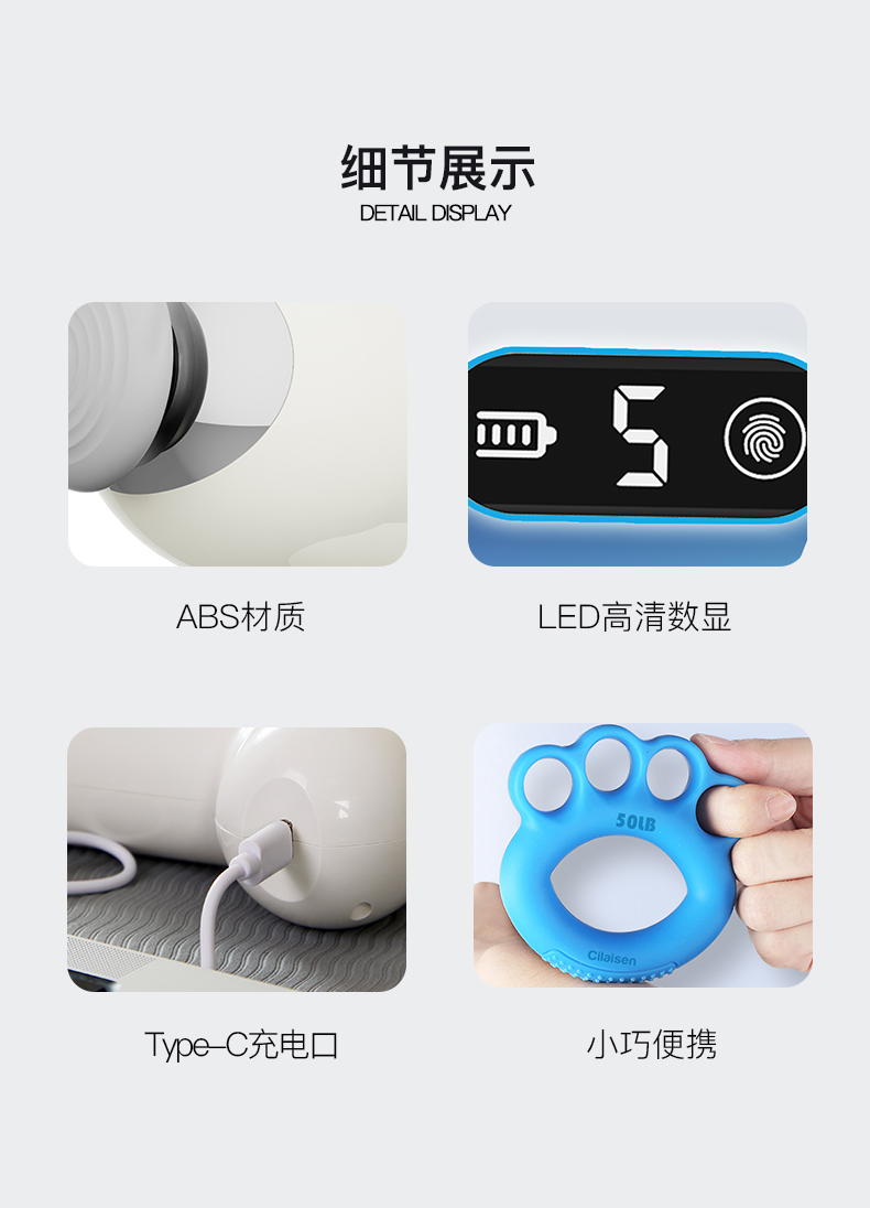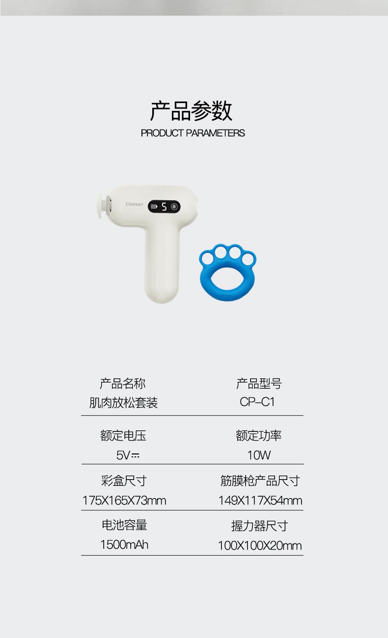 顏色:白色+藍色 額定電壓/功率:5V/10W 電池:1500mAh 握力器尺寸:100*100*20mm 筋膜槍尺寸:149*117*54mm 產(chǎn)品凈重:0.71kg 包裝清單:筋膜槍x1、握力器x1、充電線x1、說明書x1