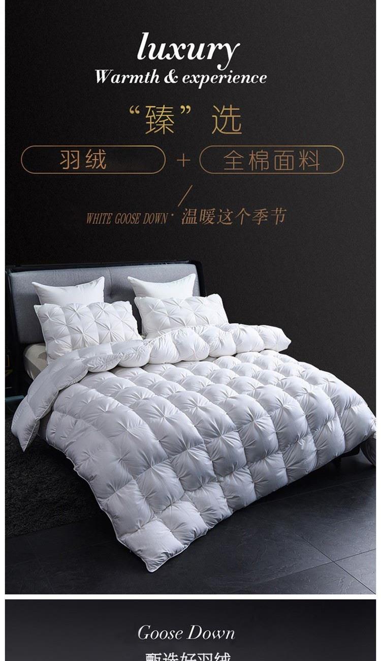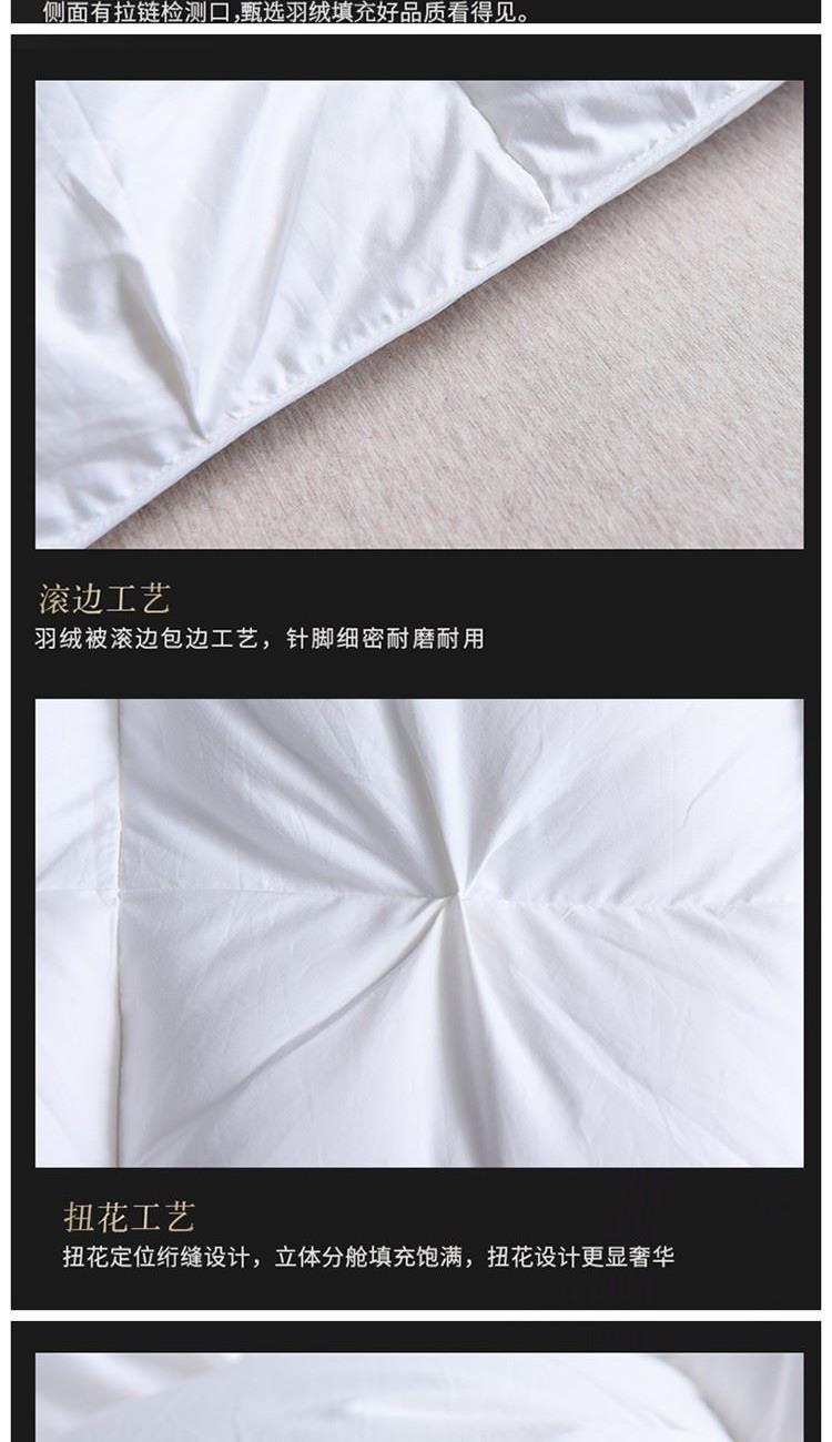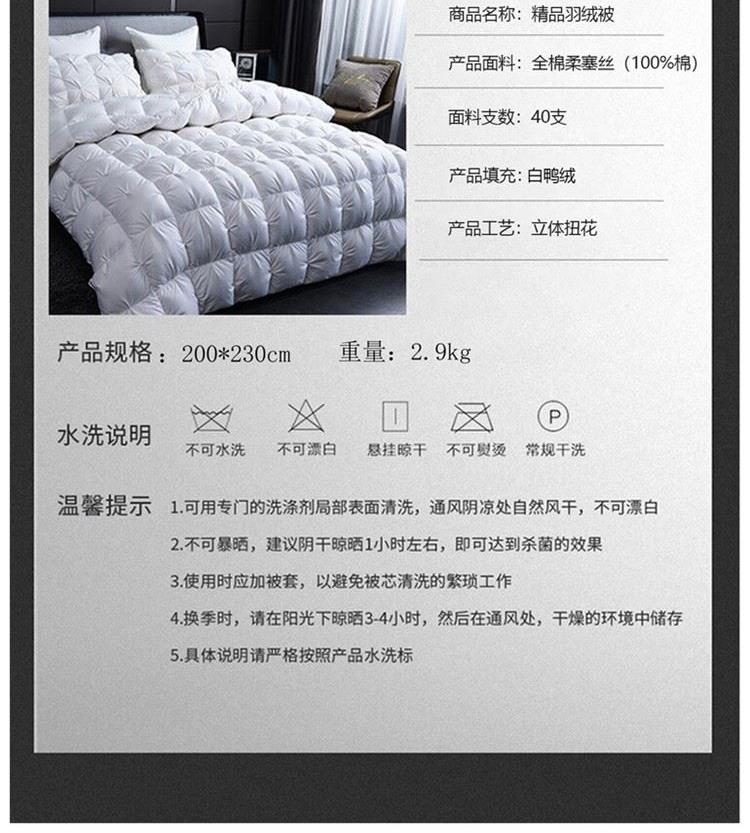 規(guī)格:200*230cm 填充:90鵝絨 面料:全棉柔塞絲(99%棉) 重量:2.9kg 1、全棉柔塞絲仿羽面料,細(xì)密編制工藝面料更厚,經(jīng)久耐用。 2、90鵝絨毛填充制作,33道水洗工藝處理,健康無異味 3、扭花的被殼工藝,手感舒適面料細(xì)膩,無節(jié)點手感柔軟