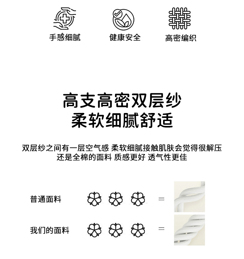 1.精選純棉材質(zhì)制作,純棉紗布具有良好的柔軟性,具有很好的抗寒作用;良好的吸水性可以避免皮膚因為潮濕而引發(fā)的刺癢過敏,同時透氣性特別好。