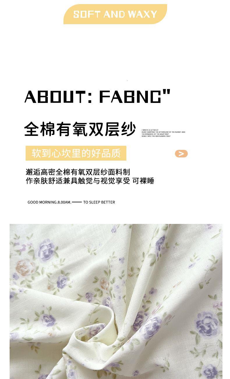 2.純棉紗布材質(zhì)的床品是綠色環(huán)保的,無污染,產(chǎn)品表面不起球,柔軟光滑,不傷害皮膚。雙層紗布上的紋理一般都比較簡單。配以小清新印花,如沐春風(fēng)