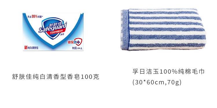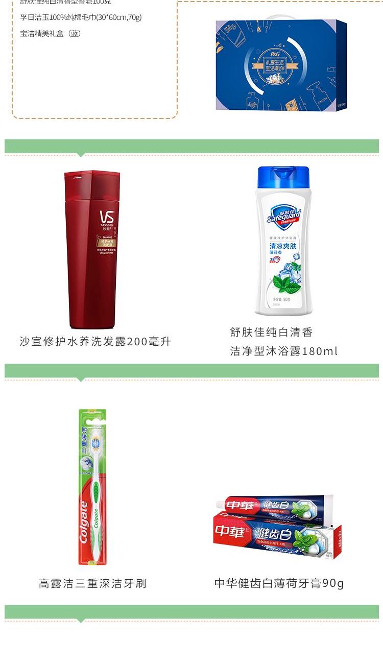 沙宣修護水養(yǎng)洗發(fā)露 200ML 舒膚佳純白清香潔凈型沐浴露180ml 高露潔三重深潔牙刷 中華健齒白薄荷牙膏90g 舒膚佳純白清香型香皂100克 孚日潔玉純棉毛巾(30*60cm,70g) 寶潔精美禮盒(藍)