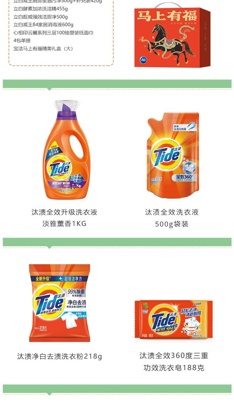 汰漬2合1深層潔凈洗衣液1KG 汰漬全效洗衣液500G袋裝 汰漬凈白去漬洗衣粉218g 汰漬全效360度三重功效洗衣皂188克 立白威王廚房重油污凈500g+補(bǔ)充裝420g 立白酵素加濃洗潔精455g 立白超威強(qiáng)效潔廁凈500g 立白威王84家居消毒液600g 心相印云麓系列三層100抽塑裝紙面巾4包單提 寶潔馬上有福精美禮盒(大)