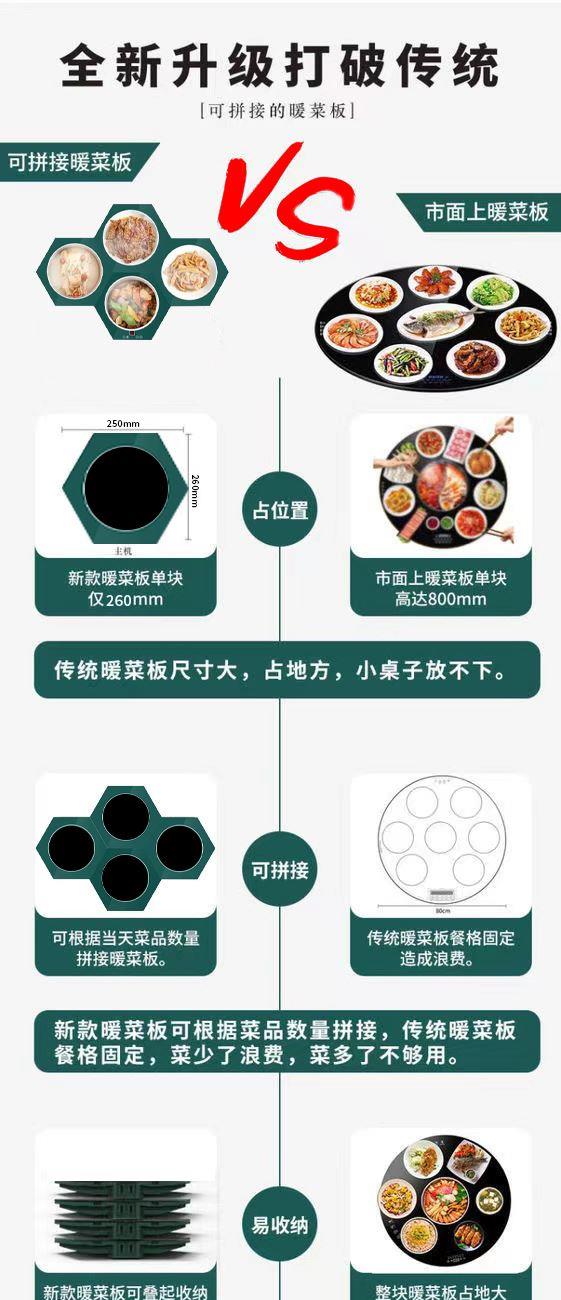 1.便攜拼接設(shè)計(jì)讓你有多少碗就拼接多少暖菜板,拆卸方便,收納無壓力