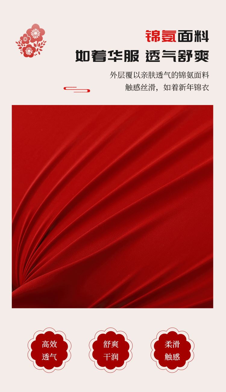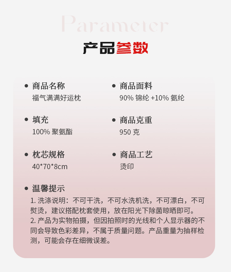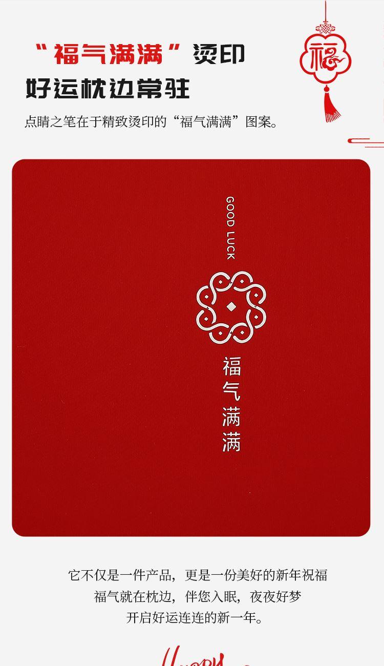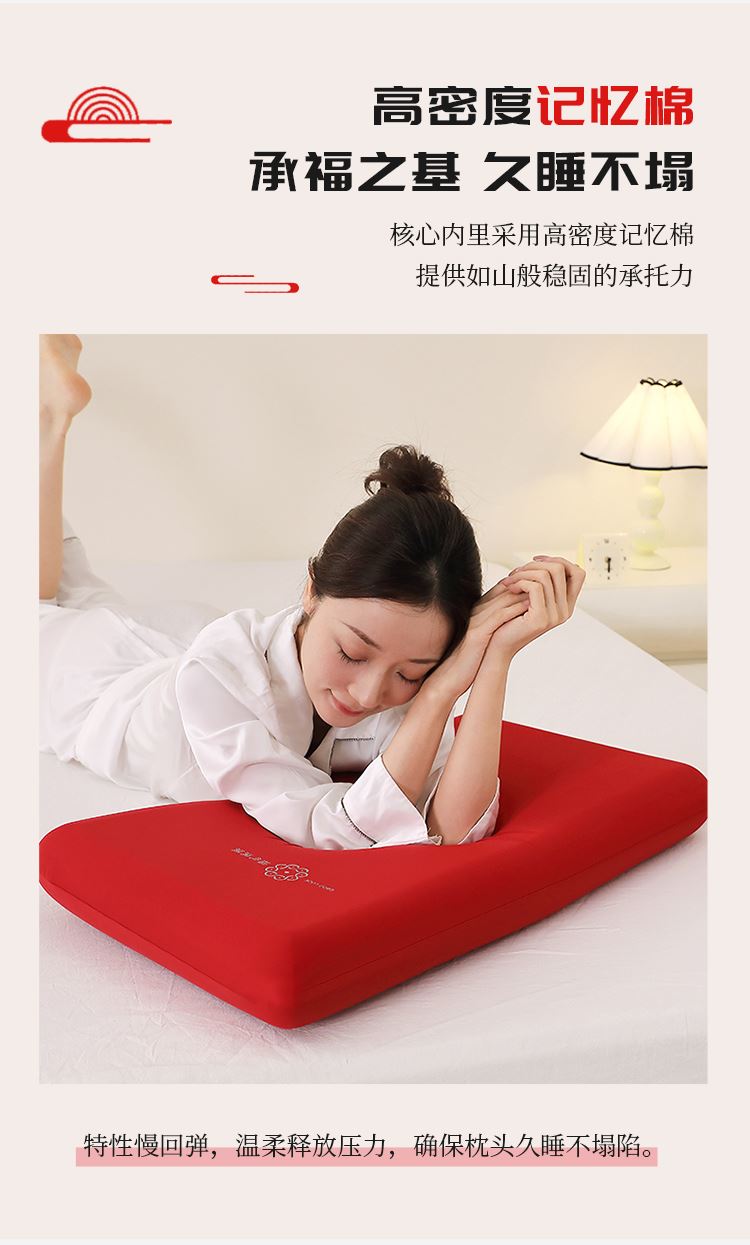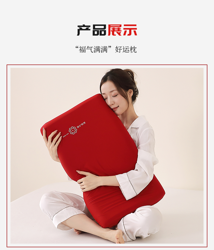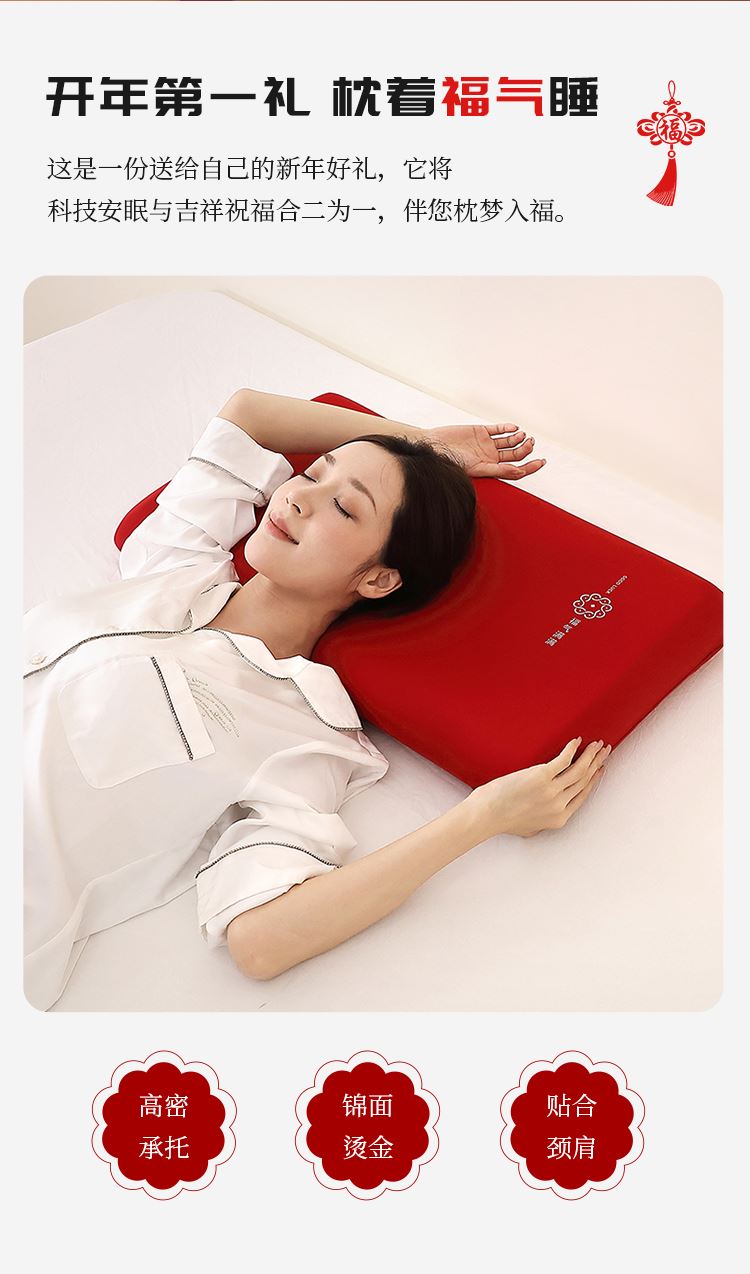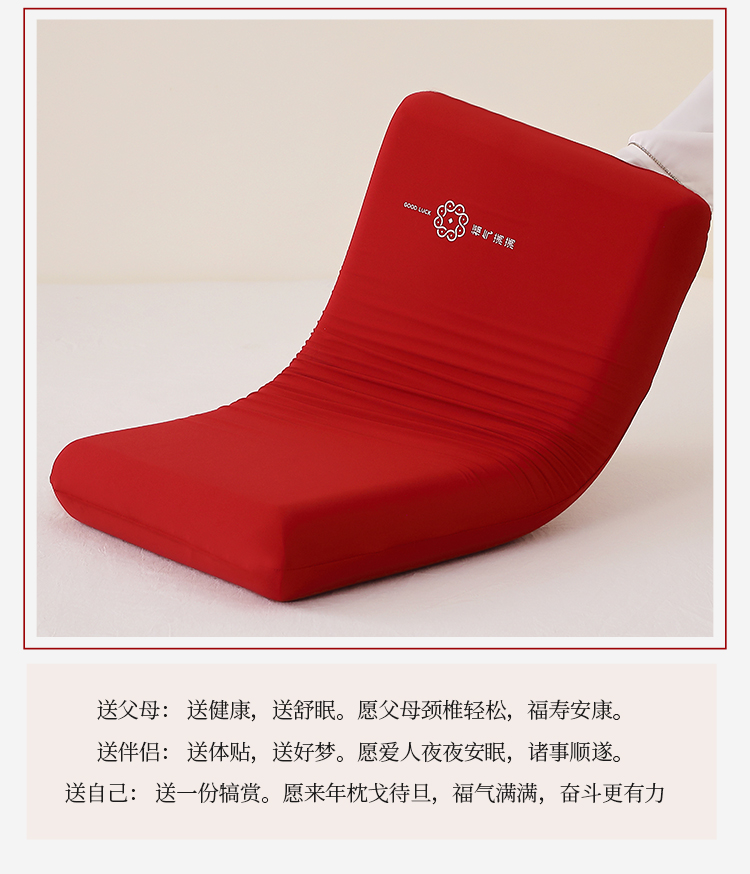 【福氣滿滿,好運(yùn)連連】 錦氨面料親膚透氣,細(xì)膩柔滑觸碰肌膚如云朵包裹;填充慢回彈記憶棉,承托釋壓,溫柔包裹每一處曲線 ; “福氣滿滿”燙印點(diǎn)綴,寓意吉祥,溫暖相伴——夜夜深睡,日日福運(yùn)相伴。大紅色禮盒,喜慶吉祥,鴻運(yùn)當(dāng)頭,好運(yùn)滿滿。