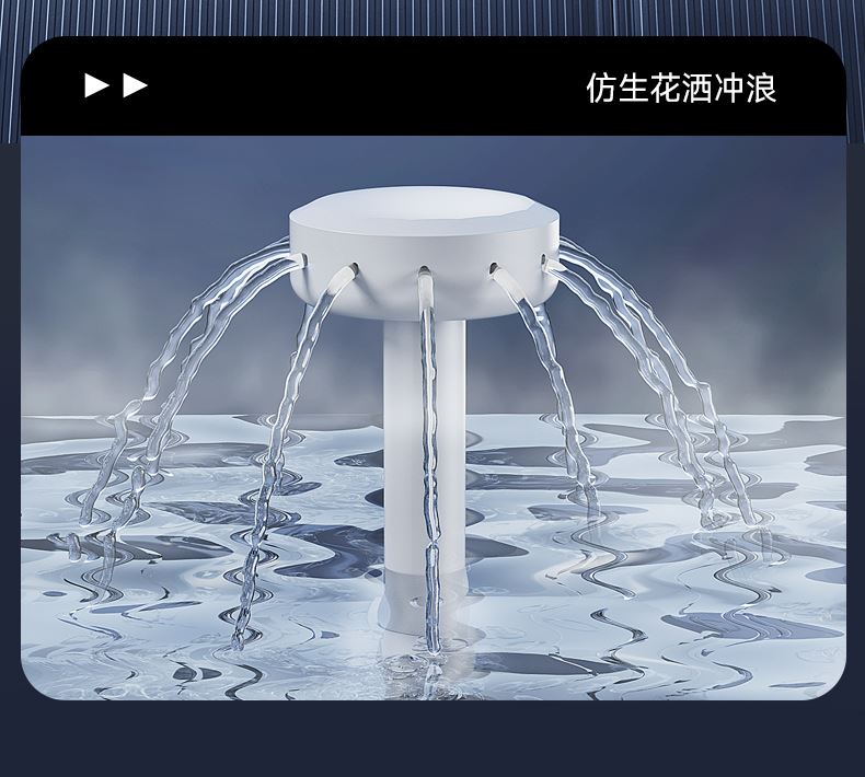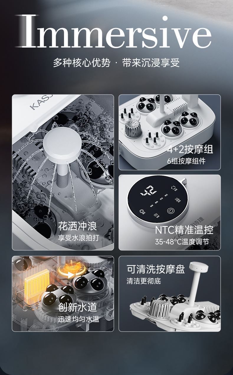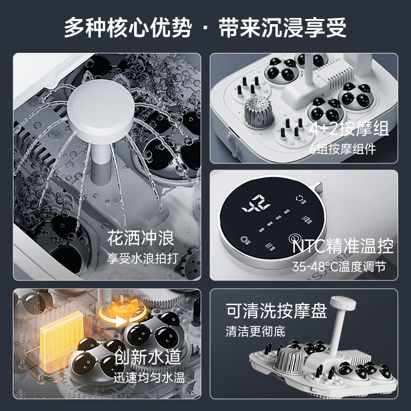 1.多種核心優(yōu)勢·帶來沉浸享受 2.4+2按摩組,6組按摩組件 3.花灑沖浪,享受水浪拍打 4.創(chuàng)新水道,迅速均勻水溫 5.可清洗按摩盤,清潔更干凈