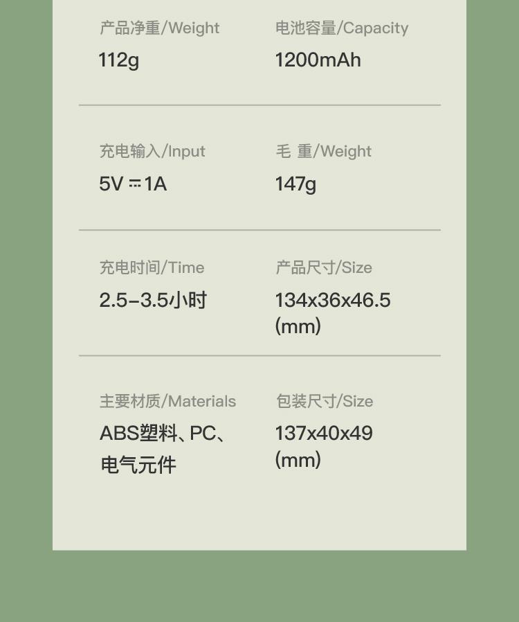 產(chǎn)品尺寸:134*36*46.5mm 外包裝:137*40*49 mm 電池容量:1200mAh 充電輸入: 5V=1A 充電時(shí)間:2.5-3.5小時(shí) 產(chǎn)品凈重:112g 產(chǎn)品毛重:147g 主要材質(zhì):ABS塑料、PC、 電氣元件 1、延長保鮮; 2、持久續(xù)航; 3、循環(huán)充電;