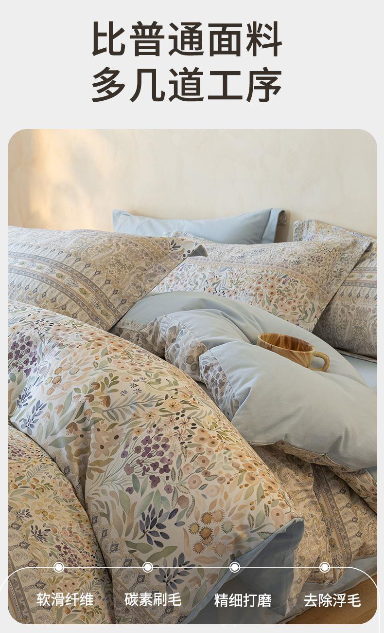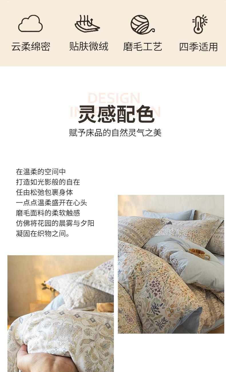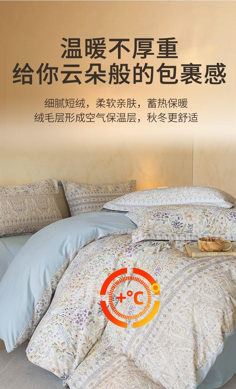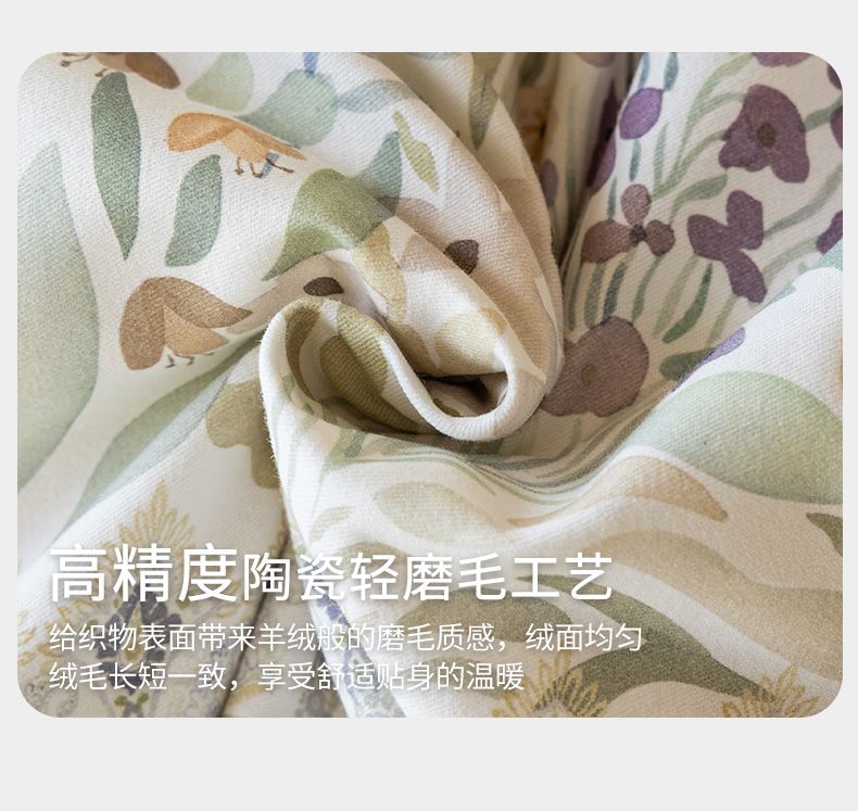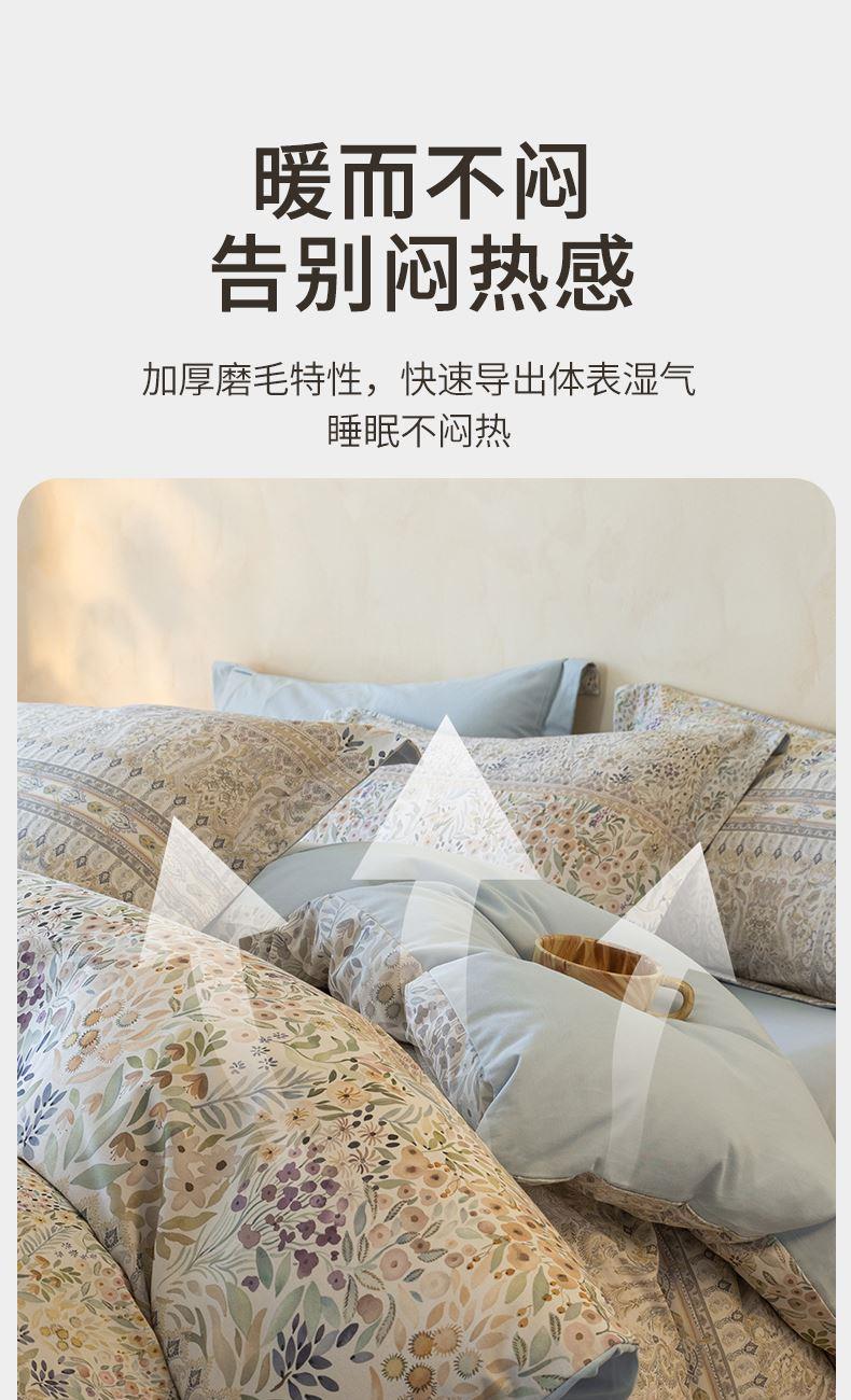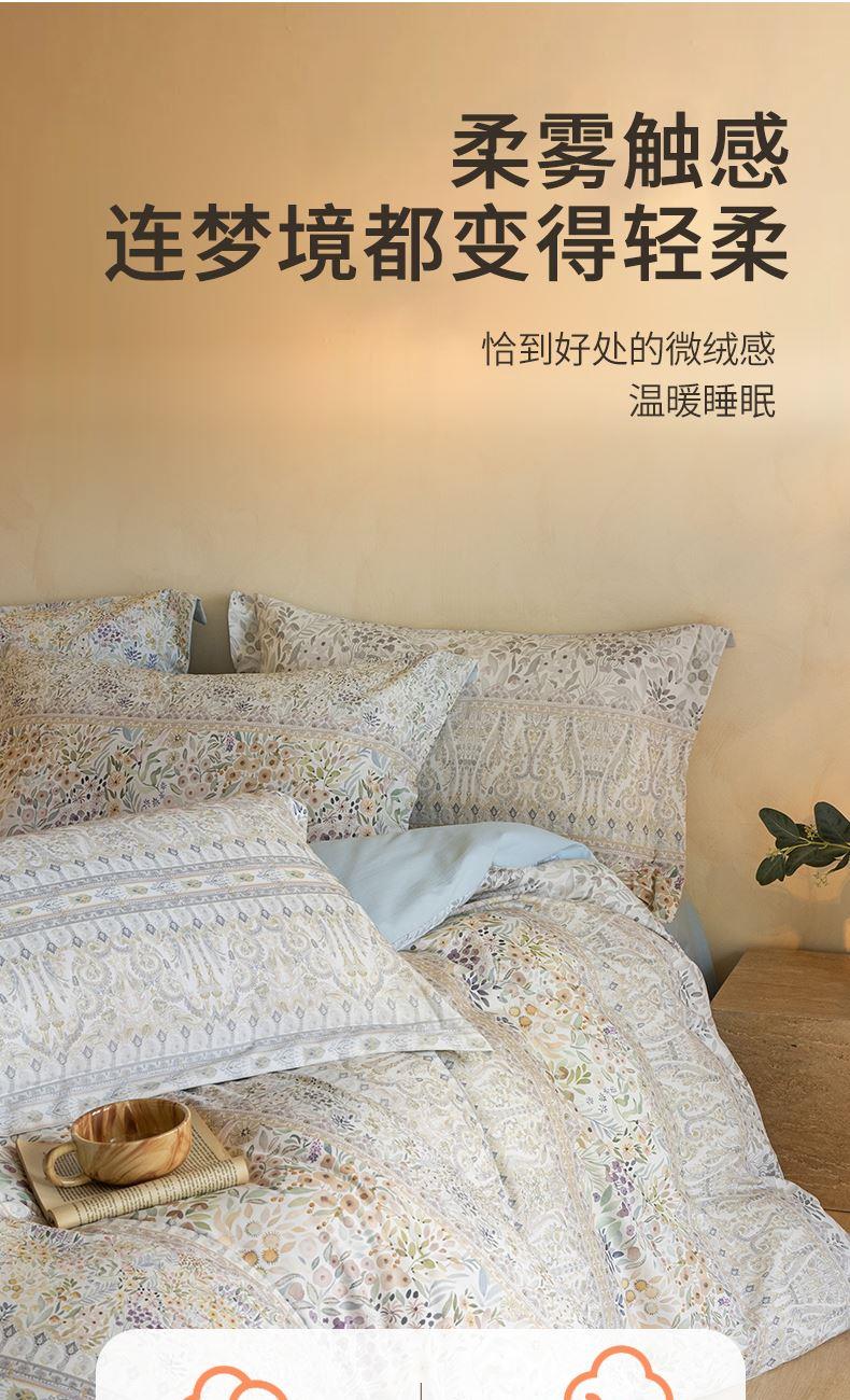 觸感暖意:加厚磨毛面料,如秋日暖陽輕覆肌膚,秋冬鉆進被窩瞬間驅散寒意,給你整夜溫柔包裹。精致數(shù)碼印花復刻復古層次感強,淺調(diào)配色自帶雅致氛圍感,鋪上床就像把藝術畫廊搬進臥室,ins 風、復古風場景都能適配。