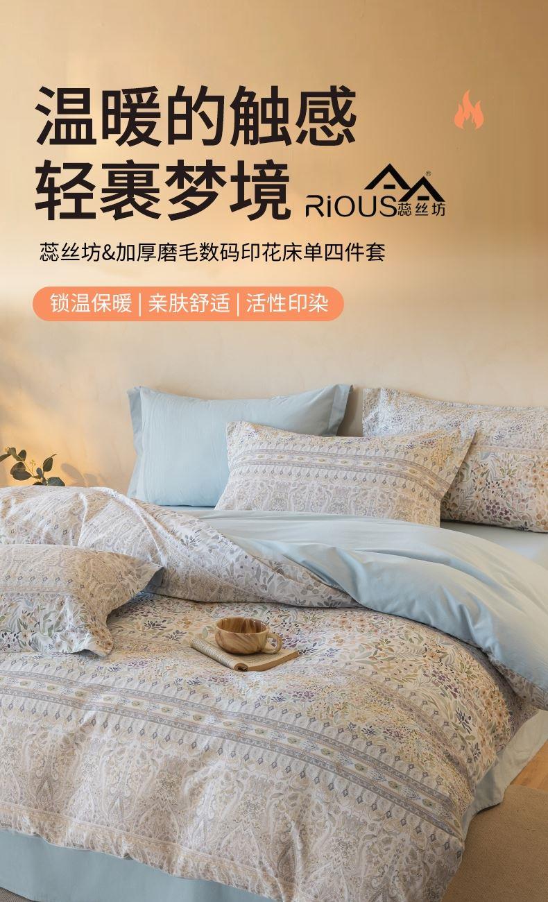 蕊絲坊家紡新款加厚磨毛數(shù)碼印花床單四件套