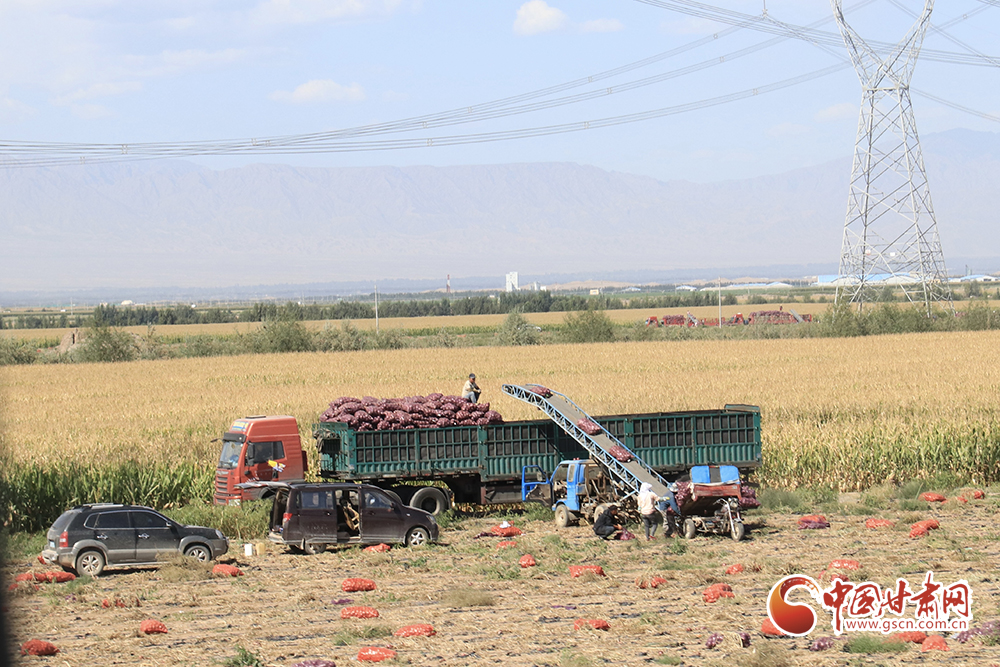 腳下有稻田,耳邊有水聲。帶著泥土的洋蔥整跺碼放,依次裝進(jìn)卡車(chē)?yán)?,鮮綠的高原夏菜在田間地頭收割后送進(jìn)發(fā)往南方的冷柜,百畝靑儲(chǔ)玉米經(jīng)過(guò)壓縮打包等待進(jìn)入牧場(chǎng)糧倉(cāng)……祁連山下秋收正在火熱進(jìn)行中。