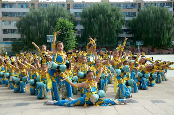 敦煌市南街小學(xué)學(xué)生排練舞蹈《鼓樂敦煌》。敦煌市委宣傳部供圖