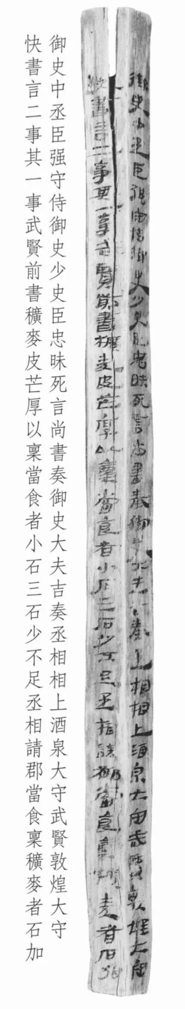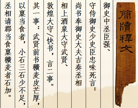 此簡(jiǎn)為漢宣帝回復(fù)酒泉太守“辛武賢”和敦煌太守“快”奏疏的恩準(zhǔn)詔書(shū),簡(jiǎn)文記載的是皇帝詔書(shū)中對(duì)兩太守奏疏內(nèi)容的復(fù)述。從簡(jiǎn)文內(nèi)容看,酒泉太守辛武賢和敦煌太守快給朝廷的奏疏主要涉及兩件事情:一是辛武賢認(rèn)為作為糧草的穬麥因皮厚芒長(zhǎng),如按規(guī)定每人發(fā)放小石三石,會(huì)造成實(shí)際數(shù)量的不足,所以他請(qǐng)求皇帝每石加發(fā)若干。另一件事顯然是敦煌太守快的上書(shū),但文字未能容納于此簡(jiǎn),故不得而知。