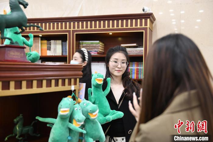 圖為游客在甘肅省博物館推出的文創(chuàng)產(chǎn)品前合影留念。戴文昌攝