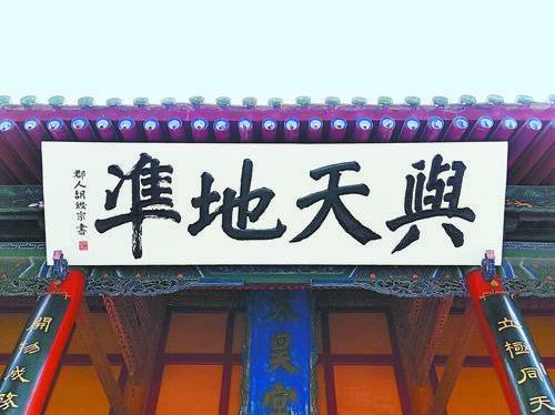 “與天地準(zhǔn)”出自《周易·系辭傳上》。原句為:“易與天地準(zhǔn),故能彌綸天地之道”。準(zhǔn),意為等、等同(此依高亨解)。有學(xué)者或?qū)?ldquo;準(zhǔn)”解釋為標(biāo)準(zhǔn),或解釋為法則等,唯高解最貼原意;彌,意為遍,普遍;綸,意為絡(luò),包絡(luò)。彌綸,意即普遍包絡(luò)。此句可釋為:《易》所闡述的“性命之理”是與天地運(yùn)行的自然法則等同的,所以它能夠包容天地之間萬事萬物的運(yùn)行規(guī)律。匾文“與天地準(zhǔn)”,是贊頌伏羲首創(chuàng)的八卦,高度概括了天地萬物運(yùn)行之規(guī)律,為人們認(rèn)識世界、改造世界提供了思想武器。