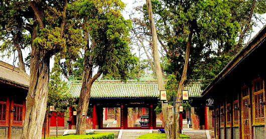 一進(jìn)中院,豁然開(kāi)闊。粗大的柏樹(shù)直沖天際,柏枝濃密,遮天蔽日。這些側(cè)柏樹(shù)干皴裂,似歷盡滄桑,而挺拔之勢(shì),猶如飛龍?jiān)谔臁7藦R的柏樹(shù)按照六十四卦方位排列種植,歷經(jīng)千年風(fēng)雨,仍有近半存活,枝繁葉茂,生生不息。先天殿就掩映在這些生長(zhǎng)了幾百年,乃至上千年的古樹(shù)中。