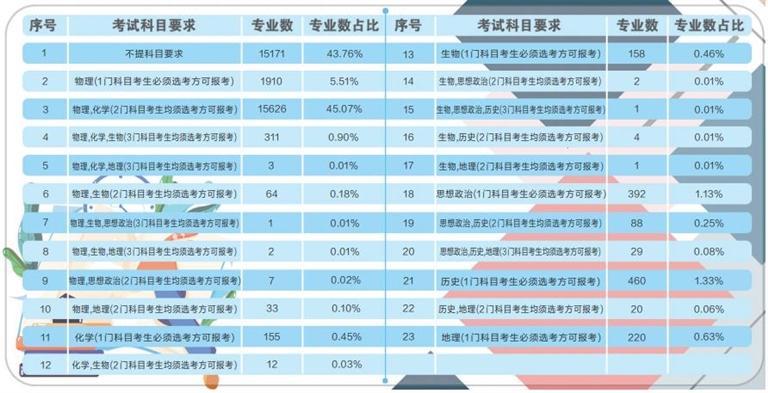 據(jù)了解,根據(jù)《甘肅省深化高等學(xué)??荚囌猩C合改革實施方案》要求,從 2021年秋季入學(xué)的普通高中一年級學(xué)生開始,實行基于統(tǒng)一高考和高中學(xué)業(yè)水平考試成績、參考綜合素質(zhì)評價的高??荚囌猩J健5?024年,基本形成分類考試、綜合評價、多元錄取的高??荚囌猩贫?,健全促進(jìn)公平、科學(xué)選才、監(jiān)督有力的高??荚囌猩w制機(jī)制。此次在我省報送選考科目要求的高校專業(yè)共計64092條,其中本科專業(yè)34670條。專業(yè)選考科目要求共有23種組合,其中不提科目要求的本科專業(yè)數(shù)量占本科專業(yè)總數(shù)的43.76%,含物理科目的占比為51.79%,含化學(xué)科目的占比為46.46%,含歷史科目的占比為1.74%,含“物理+化學(xué)”科目的占比為45.98%。
