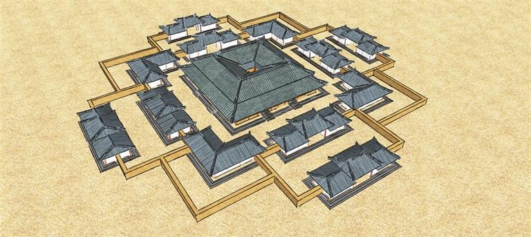 在中心夯土臺(tái)基四邊外約6.3米處平行分布有長方形附屬建筑,四角分布有曲尺形附屬建筑,對應(yīng)位置的附屬建筑結(jié)構(gòu)完全相同。長方形附屬建筑周圍有鵝卵石鋪就的散水環(huán)繞,其內(nèi)有兩個(gè)相對的方形土臺(tái),邊緣有柱洞,土臺(tái)外端中部連接夯土矮墻延伸至曲尺形建筑。四角曲尺形附屬建筑周圍亦有散水環(huán)繞,臺(tái)基邊緣有柱洞,曲尺形六邊各有一級(jí)空心磚踏步。臺(tái)基上有若干規(guī)律分布的扁平狀青石,推測應(yīng)為室內(nèi)立柱的礎(chǔ)石。曲尺形建筑的功能應(yīng)該是連接兩邊的長方形建筑,同時(shí)還要兼顧外圍次一級(jí)附屬建筑的連接。各建筑散水周圍均鋪設(shè)回紋地磚,各臺(tái)基周邊散落著瓦礫堆積。