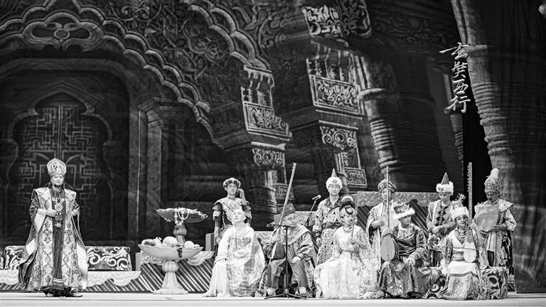 大型民族器樂劇《玄奘西行》開創(chuàng)了結(jié)合民族器樂敘事、使用戲劇形態(tài)呈現(xiàn)、利用演奏者表演的新舞臺藝術樣式,也由此開啟一種新的民樂演繹形態(tài)。作曲家出身的姜瑩身兼數(shù)職,以作曲、編劇、總導演的統(tǒng)一視角,以及新穎的審美眼光和藝術觀念,“書寫”了這部作品。因此,使用何種方式對人物進行還原和表達,便成為紀錄片《民樂西行》創(chuàng)作中的關鍵問題。