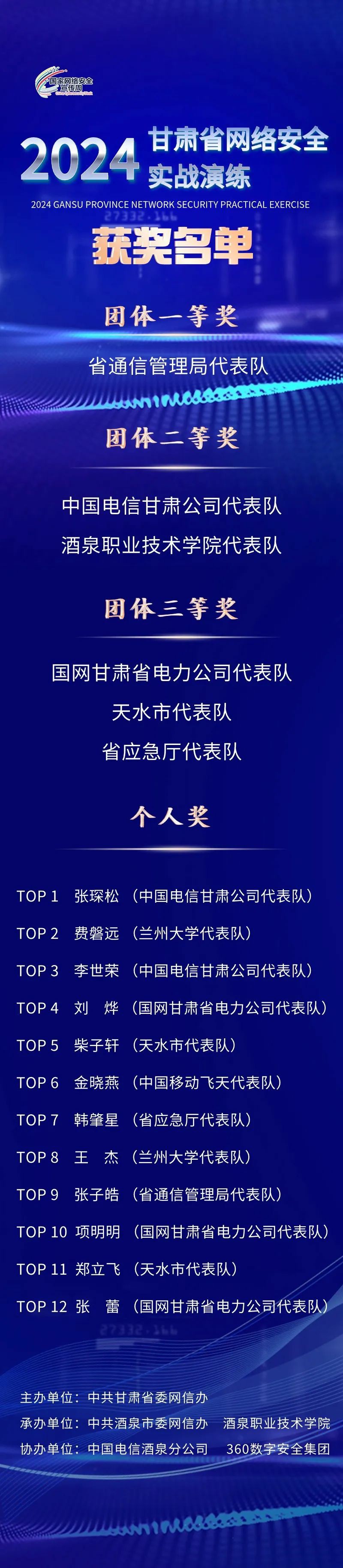 6月14日,2024年甘肅省網(wǎng)絡(luò)安全實戰(zhàn)演練在酒泉圓滿落下帷幕。來自全省各地、關(guān)鍵信息基礎(chǔ)設(shè)施保護(hù)部門、關(guān)鍵信息基礎(chǔ)設(shè)施運營單位、省內(nèi)高校、國有企業(yè)、銀行、部隊等領(lǐng)域的60支代表隊180名參演選手經(jīng)過激烈角逐,最終產(chǎn)生團(tuán)體賽一等獎1個、二等獎2個、三等獎3個,個人獎12個。