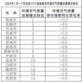 2024年1月—7月,全省14個(gè)地級(jí)城市環(huán)境空氣質(zhì)量改善情況排名由好到差分別為:臨夏州、張掖市、天水市、武威市、酒泉市、甘南州、定西市、嘉峪關(guān)市、平?jīng)鍪?、金昌市、白銀市、隴南市、蘭州市、慶陽市。